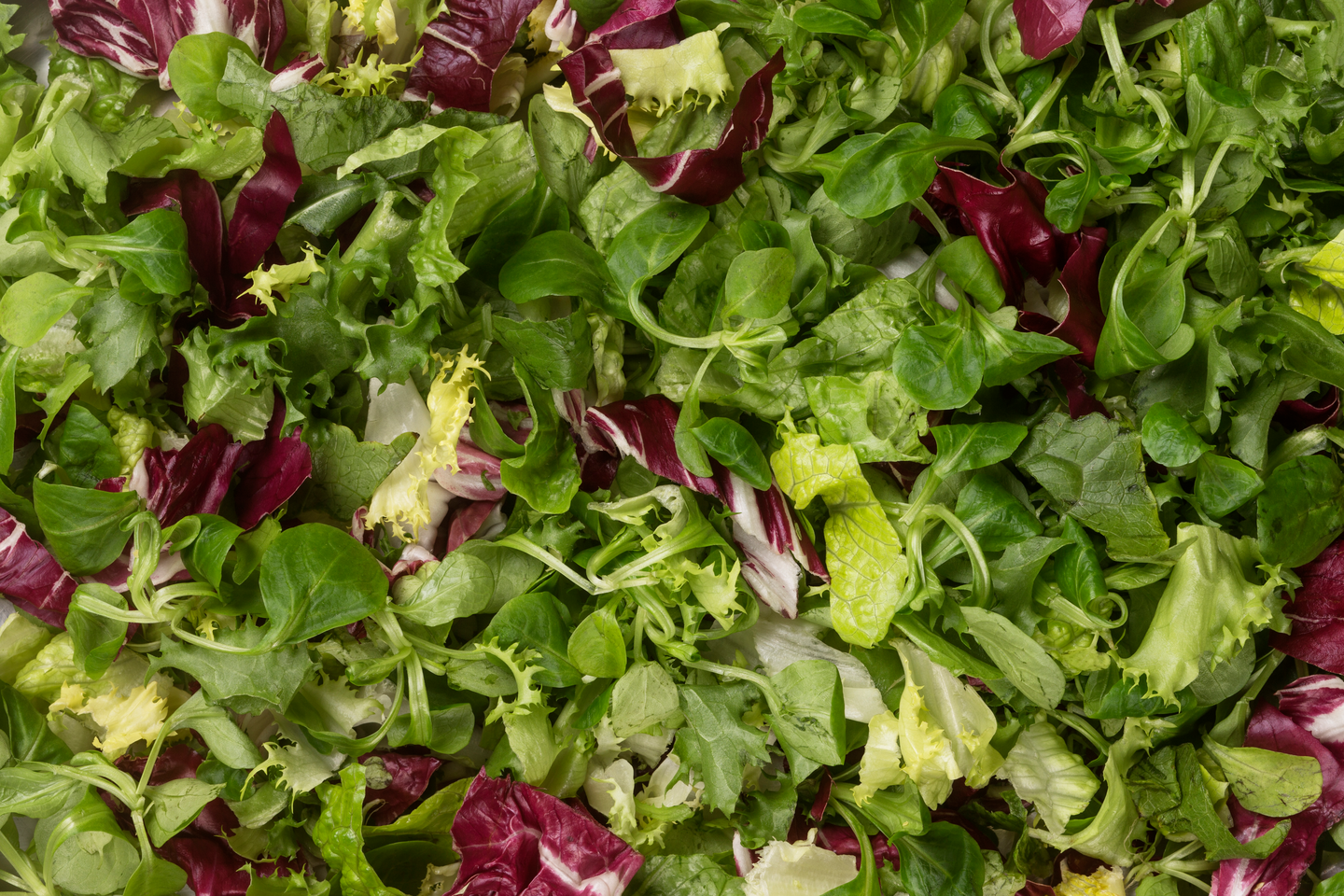 Romainesalaatti (35 %), friseesalaatti (35 %), punasalaatti (20 %) ja vuonankaali (10 %)