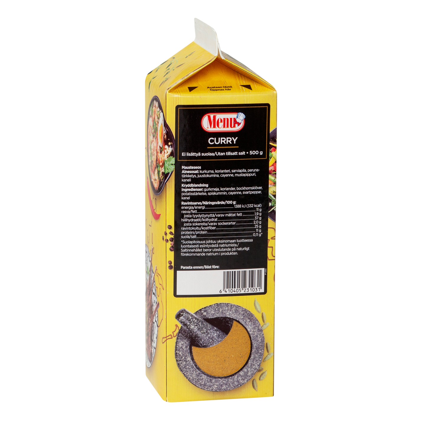 kurkuma (muu kuin EU), korianteri (EU), sarviapila, perunatärkkelys, juustokumina, cayenne, mustapippuri, kaneli