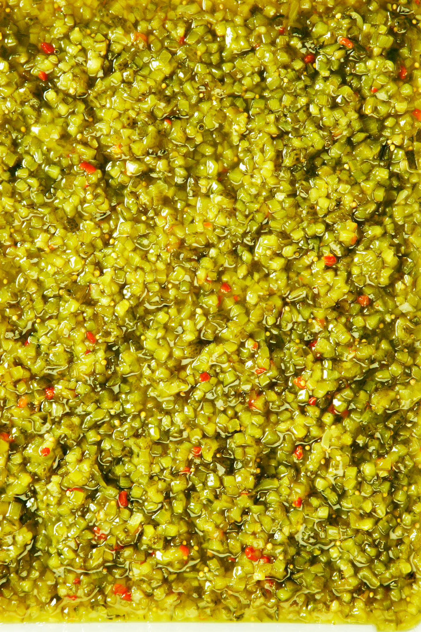 kurkku (68 %, EU), sokeri, vesi, sipuli, muunnettu maissitärkkelys, happo (E260), suola, mausteet (SINAPINSIEMEN, kurkuma, valkopippuri), paprika, sakeuttamisaineet (E407, E415), väkiviinaetikka, hapettumisenestoaineet (E331, E300), säilöntäaine (E211), aromit, väri (E150c)