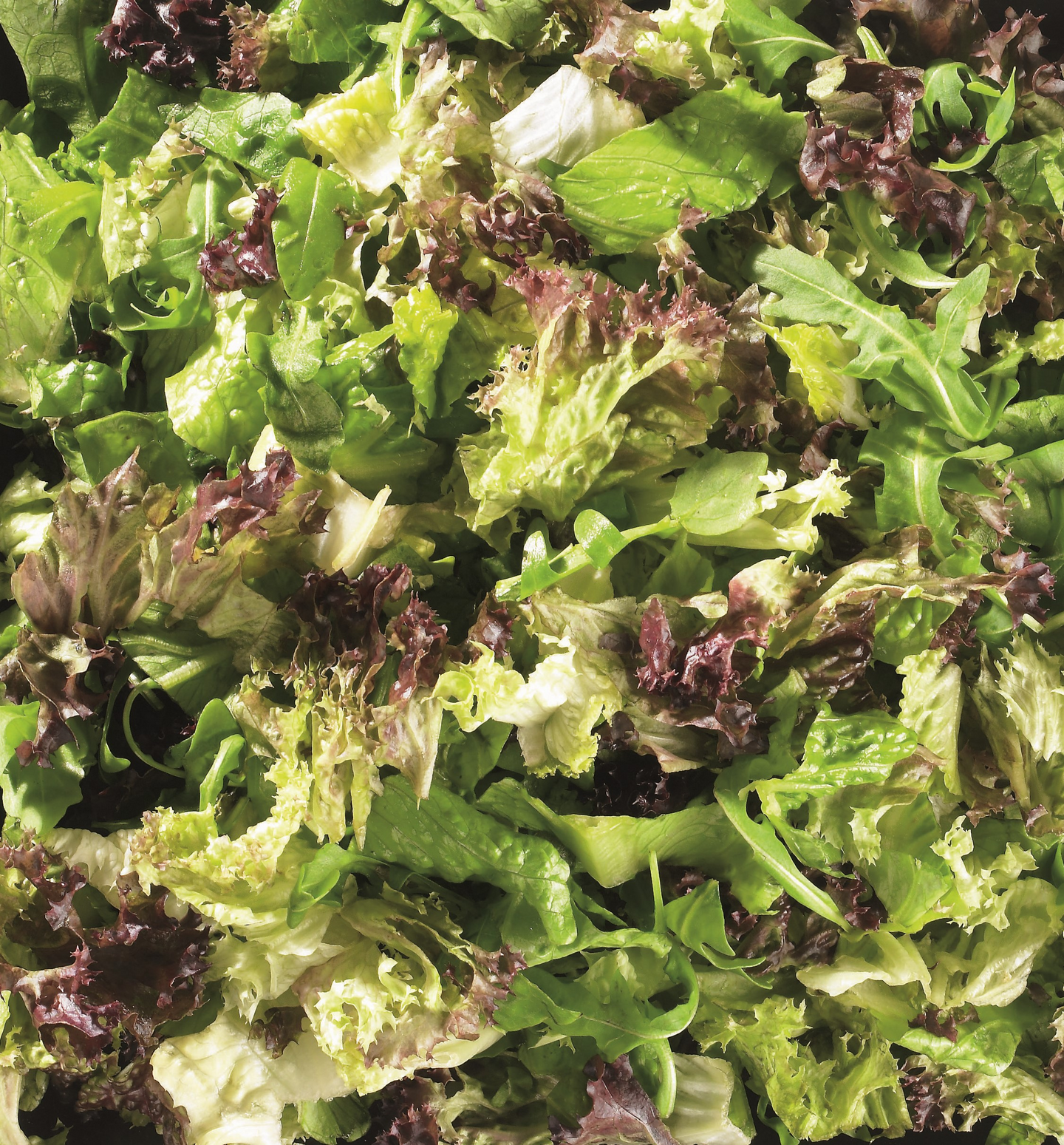 Romainesalaatti (45 %), punainen salaatti (lollo rosso, batavia ja tammenlehti vaihtelevat sesongin mukaan) (45 %), rucola.