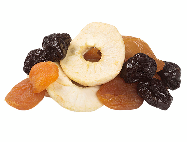 kuivattu luumu (40 %), kuivattu aprikoosi (30 %), kuivattu päärynä (15 %), kuivattu omena (15 %), säilöntäaineet (RIKKIDIOKSIDI, kaliumsorbaatti). Saattaa sisältää pieniä määriä maapähkinää, pähkinää ja seesaminsiemeniä.