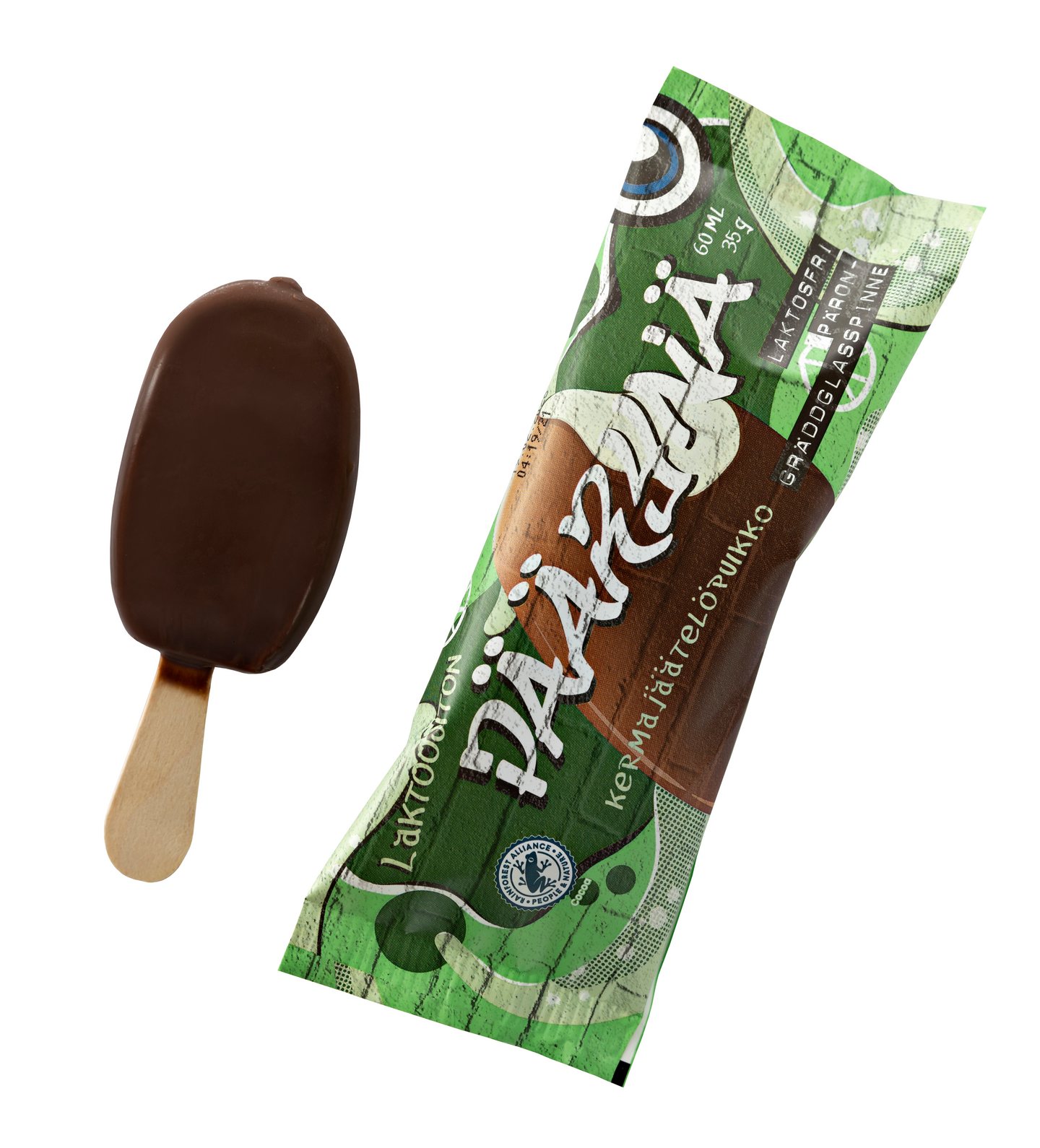 LaktoositonLaktoositon päärynänmakuinen kermajäätelöpuikko suklaanmakuisella kuorrutteella.