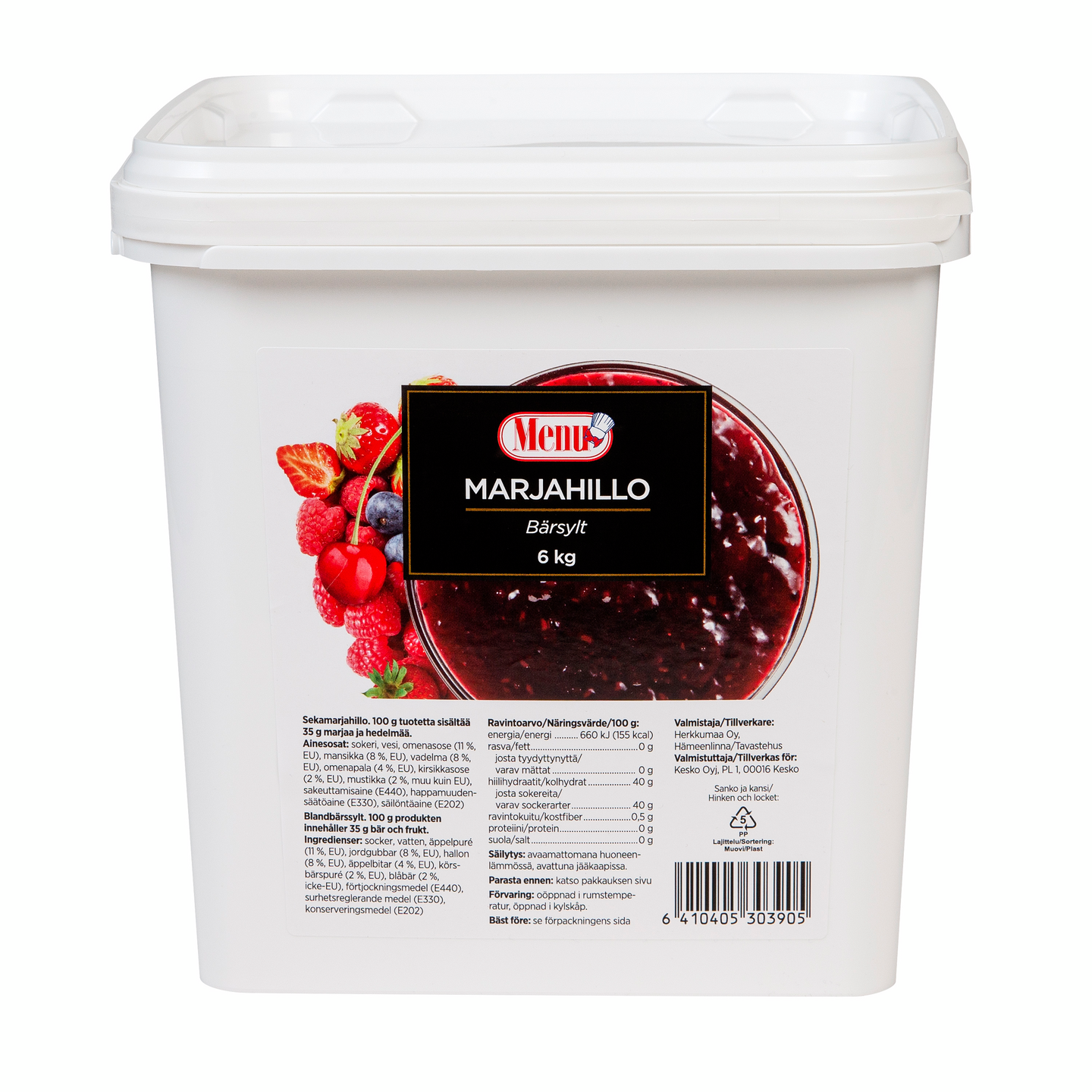 Sokeri, vesi, omenasose (11%, eu) , mansikka (8%, eu), vadelma (8%, eu), omenapala (4%, eu), kirsikkasose (2%, eu), mustikka (2%, muu kuin eu), sakeuttamisaine (pektiini), säilöntäaine (kaliumsorbaatti), happamuudensäätöaine (sitruunahappo). 100 g tuotetta sisältää 35 g marjaa ja hedelmää.