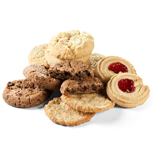 Kaurakeksi: sokeri, KAURAhiutale (25 %), kasvimargariini (kasvirasvat ja –öljyt (palmu SG, palmunydin, rapsi), vesi, suola, emulgointiaine (E471), aromi, happamuudensäätöaine (E330)), VEHNÄjauho, vesi, KANANMUNAjauhe, nostatusaineet (E500, E450, E503), maissitärkkelys. Saattaa sisältää pieniä määriä pähkinää. Suklaakeksi: VEHNÄjauho, sokeri, suklaa (20 %) (sokeri, kaakaomassa, kaakaovoi, emulgointiaineet (E322 auringonkukkalesitiini, E476), aromi), kasvimargariini (kasvirasvat ja -öljyt (palmu SG, karite, palmunydin, rapsi, kookos), vesi, suola, emulgointiaine (E471), aromi, happamuudensäätöaine (E330)), kasviöljy (rapsi), vähärasvainen kaakaojauhe, sokerisiirappi, nostatusaineet (E503, E500, E450), suola, aromi, maissitärkkelys. Saattaa sisältää pieniä määriä kauraa, kananmunaa, soijaa, maitoa ja pähkinää. Vadelmasilmä: VEHNÄjauho, kasvimargariini (kasvirasvat ja -öljyt (palmu SG, karite, palmunydin, rapsi, kookos), vesi, suola, emulgointiaine (E471), aromi, happamuudensäätöaine (E330)), sokeri, vadelmatäyte (12 %) (sokeri, vesi, vadelmasose (10 %), omenatiiviste, muunnettu tapiokatärkkelys, sakeuttamisaine (E440), porkkanatiiviste, happamuudensäätöaine (E330), säilöntäaine (E202), aromi), sokerisiirappi, vesi, aromi. Saattaa sisältää pieniä määriä kauraa, kananmunaa, soijaa ja pähkinää. Vaniljakeksi: VEHNÄjauho, sokeri, kasvimargariini (kasvirasvat ja -öljyt (palmu SG, karite, palmunydin, rapsi, kookos), vesi, suola, emulgointiaine (E471), aromi, happamuudensäätöaine (E330)), kasviöljy (rapsi), nostatusaine (E503), aromi (vanilja). Saattaa sisältää pieniä määriä kauraa, kananmunaa, soijaa ja pähkinää.