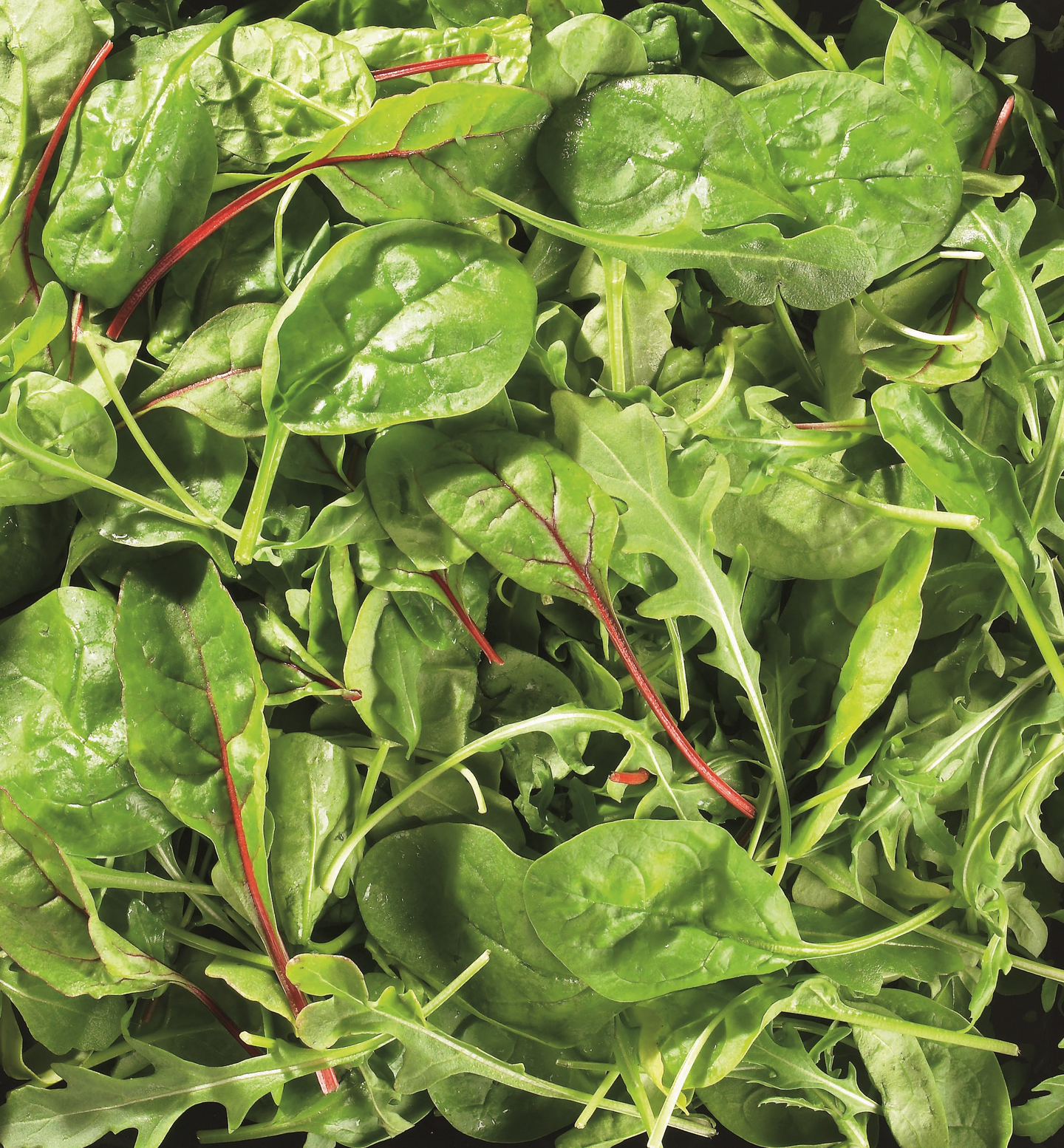 Babypinaatti (45 %), rucola (40 %), punamangoldi (15 %).
