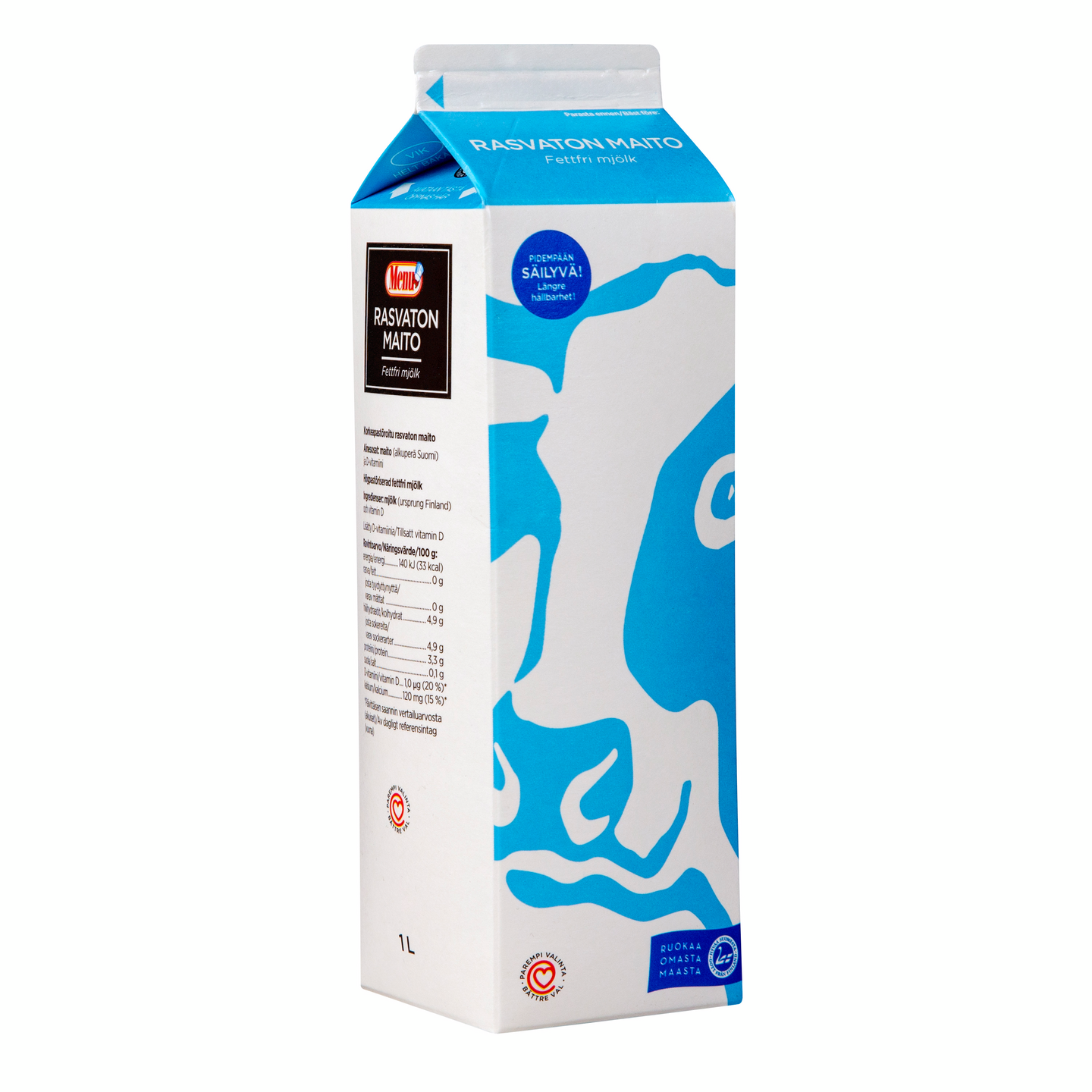 Menu rasvaton maito säilyy pidempään ja siksi auttaa vähentämän ruokahävikkiä. Maito sisältää luontaisesti kalsiumia ja B-ryhmän vitamiineja sekä lisättyä D-vitamiinia. Tuotteessa on Hyvää Suomesta -merkki.