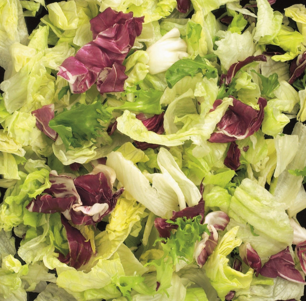 Jäävuorisalaatti (80 %), friseesalaatti (10 %), punasalaatti (10 %).