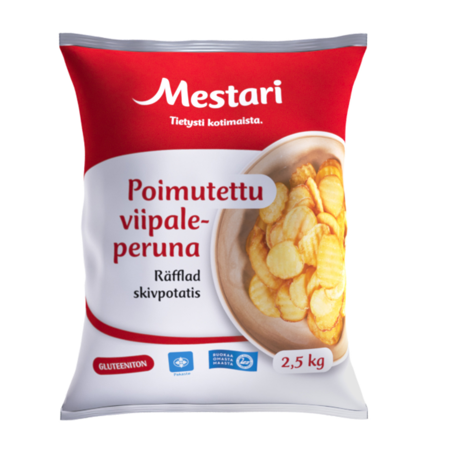 Mestari Poimutettu viipaleperuna, kätevät ja rapean kuohkeat viipaleet. Tietysti kotimaista, maista ja nauti! Pakastetuote. Gluteeniton. Laktoositon.