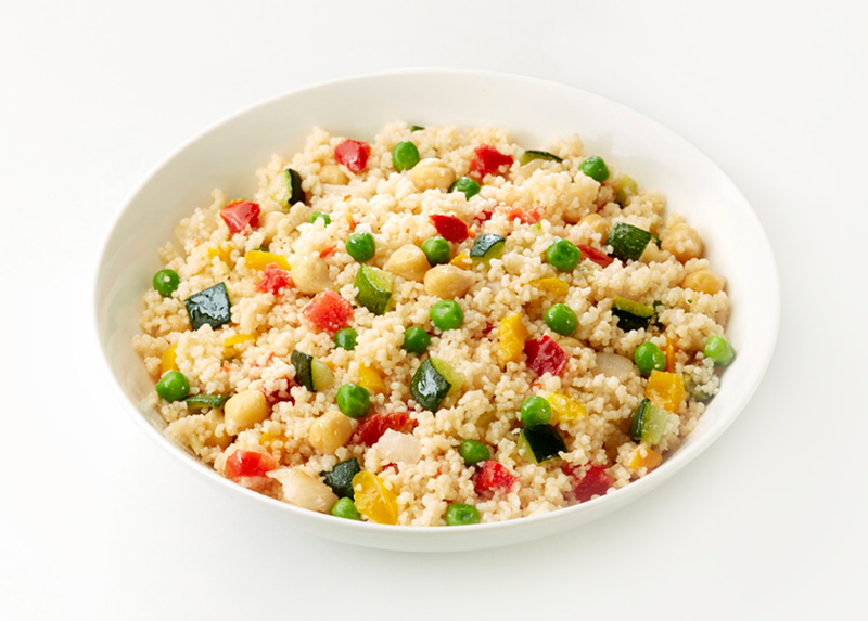 esikeitetty couscous 48% (vesi, durum VEHNÄ semolina (GLUTEENI), suola) grillattu kesäkurpitsa 11%, grillattu punainen ja keltainen paprika 10%, esikeitetty kikherne (vesi, kikherne, suola) 8,5%, esikeitetty herne 8,5%, tomaatti, grillattu sipuli. Saattaa sisältää jäämiä soijasta ja sinapista.