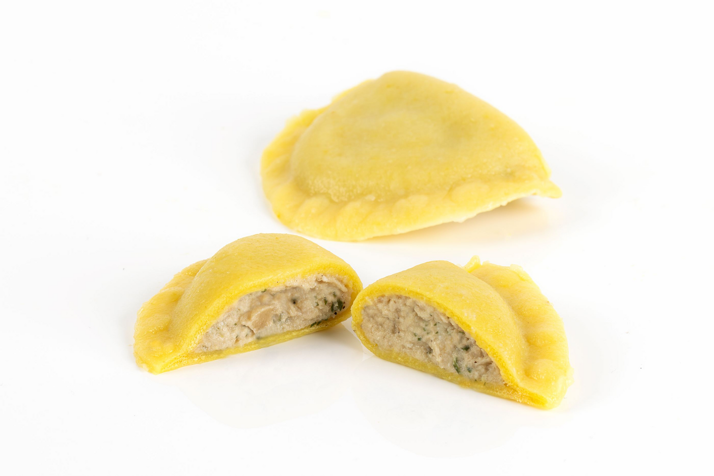 Aineosat: DURUMVEHNÄJAUHO, herkkutatti 23 %, karkea VEHNÄJAUHO, tuoreJUUSTO, vesi, ricottaJUUSTO, sipuli, pastöroitu KANANMUNA, perunahiutaleet, suola, mausteet (persilja, pippuri, valkosipuli, sienitiiviste, kurkuma, rosmariini, muskottipähkinä, salvia). Täytteen osuus 50 %. Vähälaktoosinen.