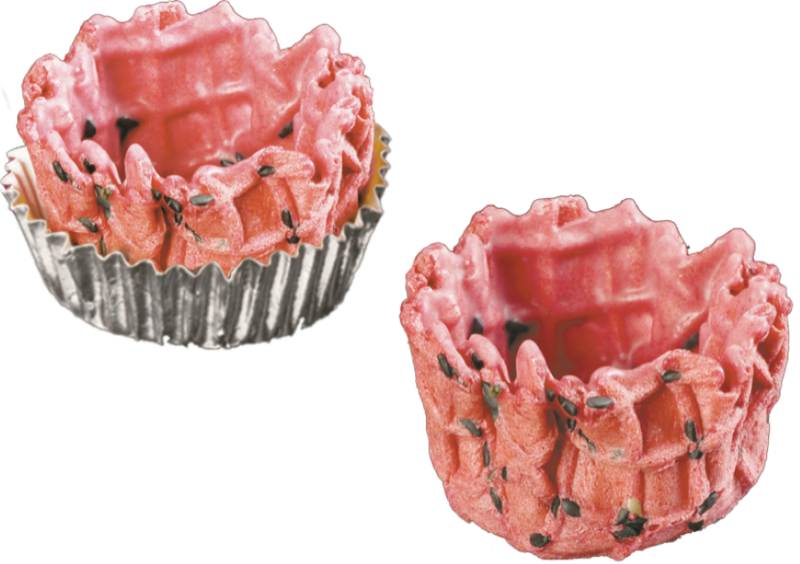 VEHNÄjauho (GLUTEENI), pinnoite (kaakaovoi, MAITOjauhe, sokeri, suola, emulgointiaine: auringonkukkalesitiini (E322), vaniljauute, musta SEESAMI, väri: kokkinelli karmiini (E120), sokeri, punajuurimehu (tuore punajuuri, vesi) (9,47 %), JUUSTOjauhe (MAITO), kookosöljy, MANTELIjauhe, suola, punajuurijauhe (0,85 %) , Tapioka tärkkelys, emulgointiaine. SOIJAlesitiini (E322), valkosipulijauhe, nostatusaine: ruokasooda (E500ii), mustapippurijauhe. Saattaa sisältää jäämiä kananmunasta.
