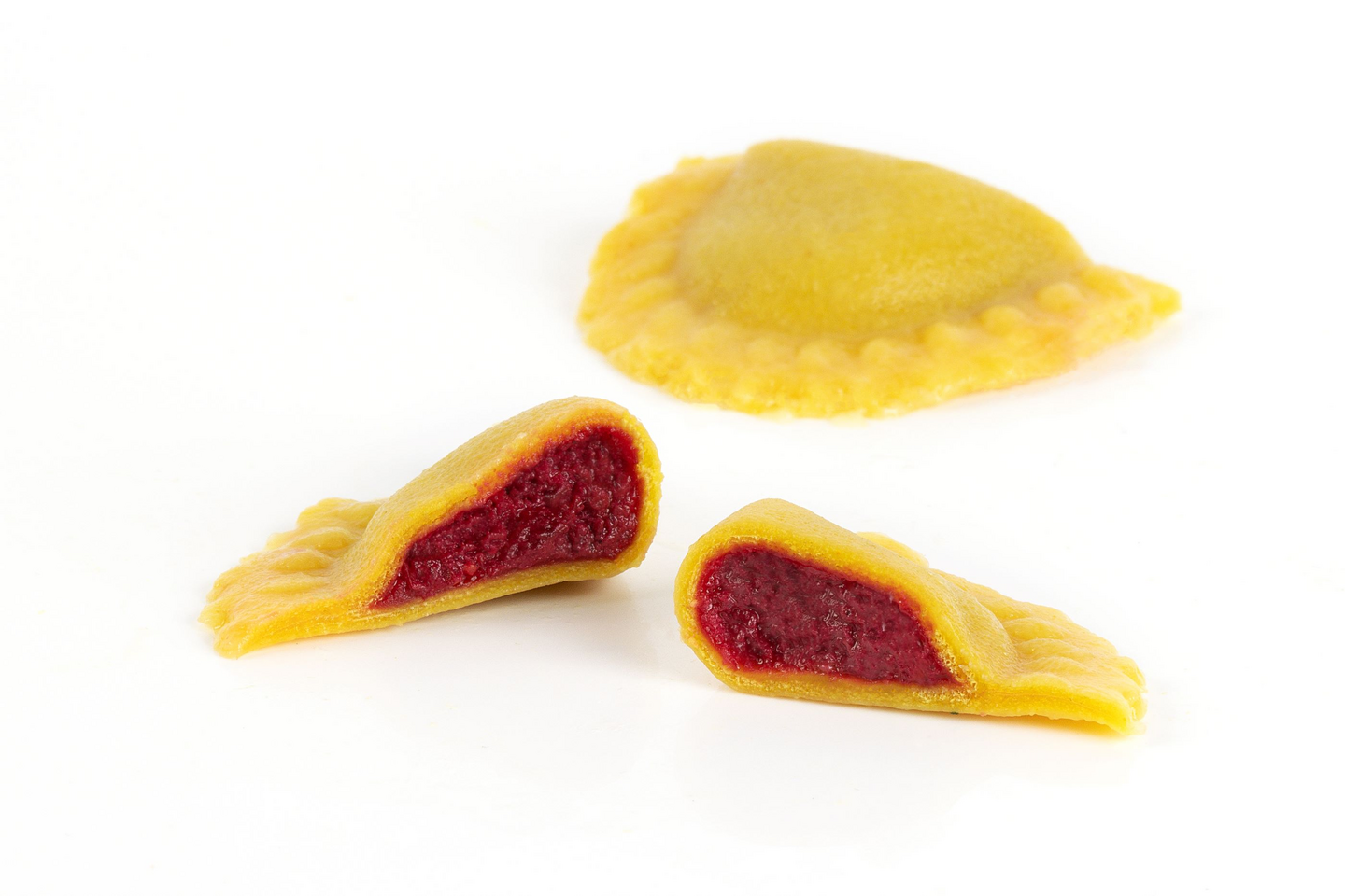 DURUMVEHNÄ, karkea VEHNÄJAUHO, vesi, vähärasvainen tuoreJUUSTO, punajuuri 9,4 %, KANANMUNA, VOI, provolonejuusto (MAITO, suola, juoksute), punajuurijauhe, piparjuuritahna (piparjuuri, rypsiöljy, sitruunamehu), kasvisliemi (merisuola, maltodekstriini, raakasokeri, maustejauho 7,8 %( palsternakka,sipuli, tomaatti), karamellisokeri, auringonkukkaöljy, mausteet), suola, kurkuma, sitruunamehu, valkosipuli, kumina, pippuri, muskottipähkinä, chili. Täytettä 30 %.