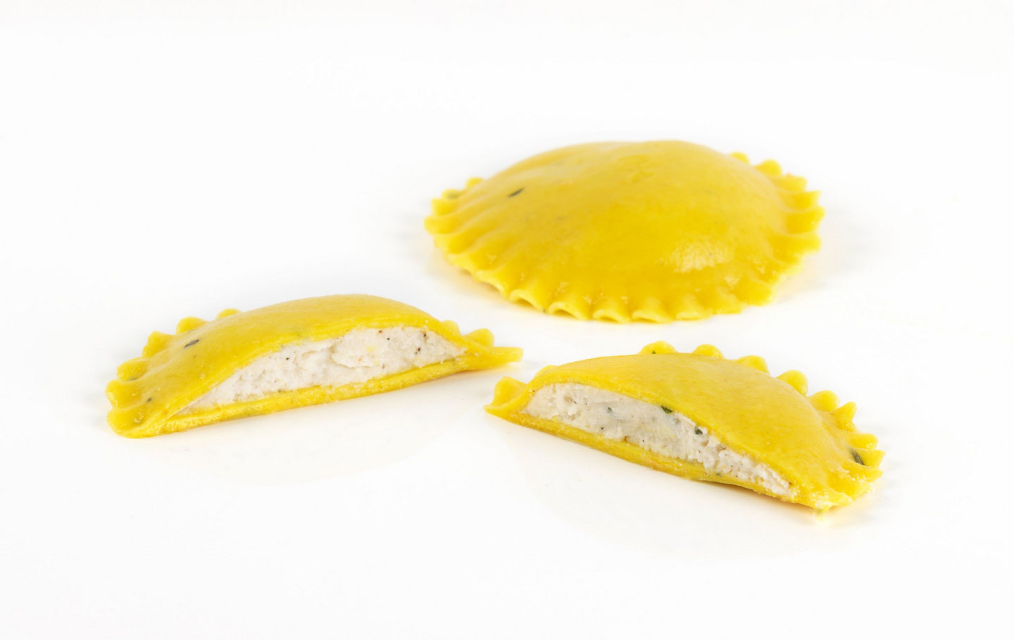 DurumVEHNÄsemolina, RICOTTA (HERAproteiini pastöroidusta MAIDOSTA, happamuudensäätöaine [sitruunahappo, maitohappo], suola), tuoreJUUSTO (tuorejuusto, suola; sisältää mikrobista juoksutetta), karkea VEHNÄjauho, vesi, rapsiöljy, pastöroitu KANANMUNA, sitruunapyree 4 %, basilika 2,4 %, korppujauhoja (VEHNÄjauho, suola, hiiva), suola, ruokosokeri, kurkuma, pippuri. Täytteen osuus 50 %.