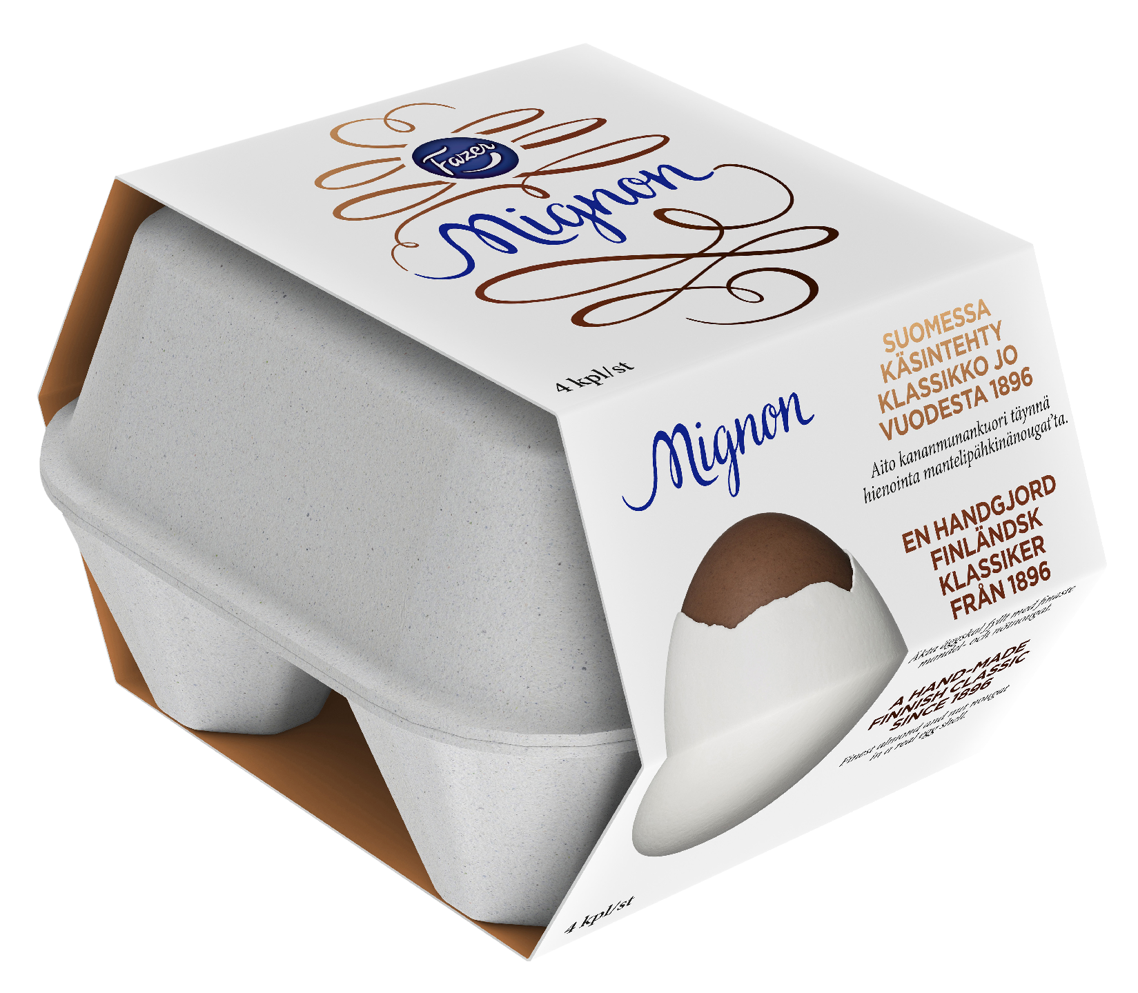 MaidotonMignon-muna, Fazerin ainutlaatuinen klassikko vuodelta 1896, kruunaa pääsiäisen. Aitoon kananmunankuoreen käsin valettu herkku sulkee sisäänsä suussa sulavan mantelipähkinänougattäytteen. Koristele Mignon oman makusi mukaan, kuori ja nauti! Vie Mignon-muna ihanaksi keväiseksi lahjaksi tai varaa munia virpojia varten. Noudatamme kaakaonhankinnassamme Fazerin kaakaovisiota. Lue lisää www.fazercocoavision.com.