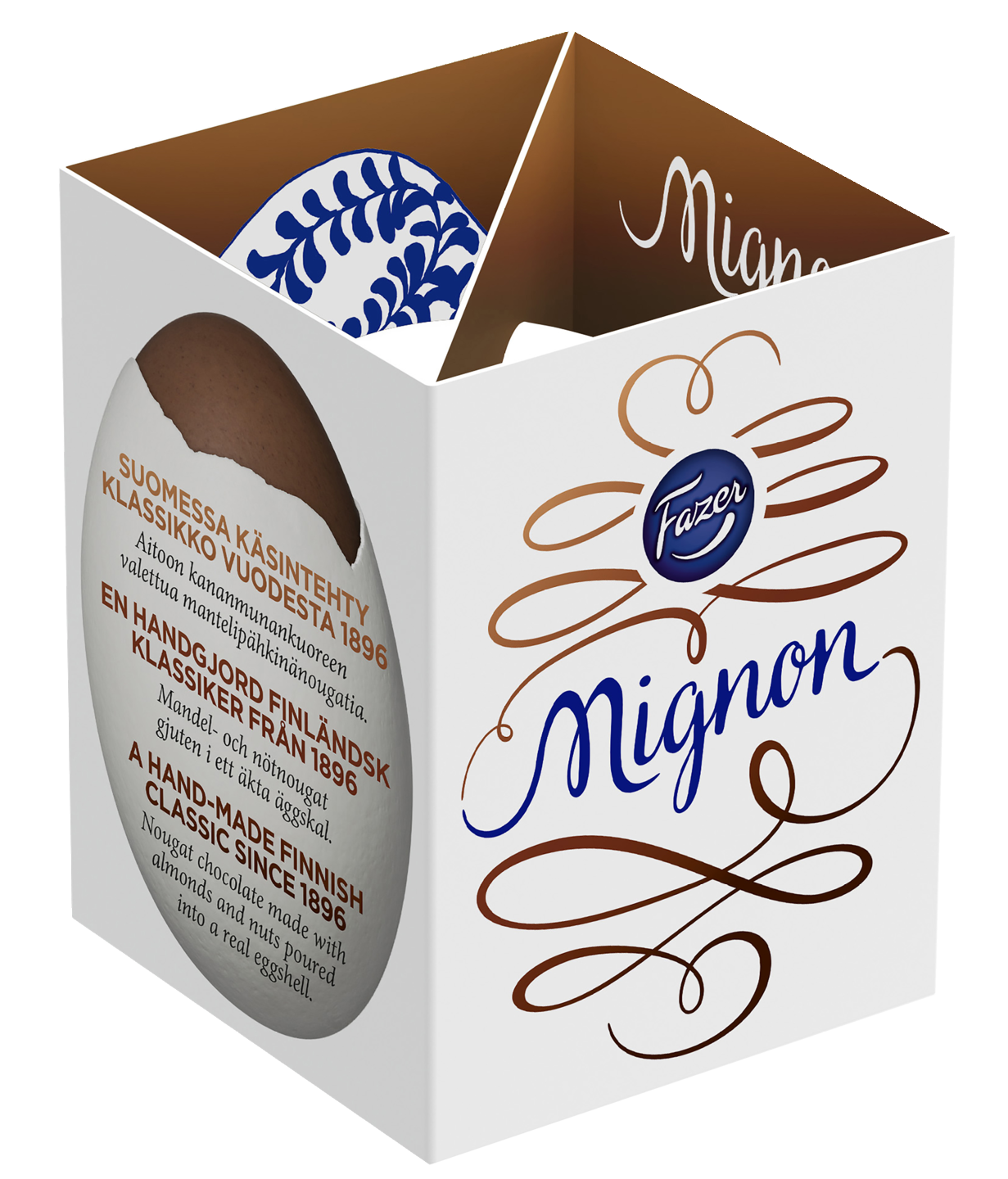 MaidotonMignon-muna, Fazerin ainutlaatuinen klassikko vuodelta 1896, kruunaa pääsiäisen. Aitoon kananmunankuoreen käsin valettu herkku sulkee sisäänsä suussa sulavan mantelipähkinänougattäytteen. ?Koristele Mignon oman makusi mukaan, kuori ja nauti! Vie Mignon-muna ihanaksi keväiseksi lahjaksi tai varaa munia virpojia varten. Noudatamme kaakaonhankinnassamme Fazerin kaakaovisiota. Lue lisää www.fazercocoavision.com.