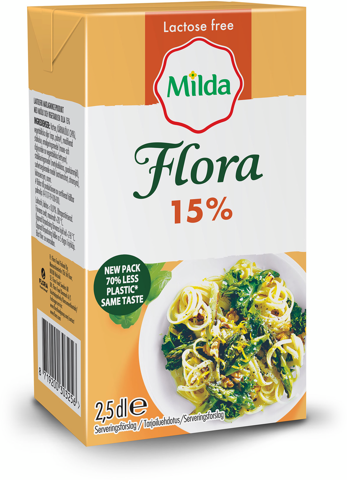 LaktoositonFlora by Milda Ruoka 15 % laktoositon on ruoanlaittotuote, joka on valmistettu kasviöljyistä ja maidosta. Flora by Milda Ruoka 15 % erinomaisesti käytettäväksi kastikkeisiin, keittoihin, patoihin ja gratiineihin. Flora by Milda Ruoka 15 % kestää hyvin sekä hauduttamista että kuumentamista, joten onnistut kokkailuissasi takuuvarmasti!