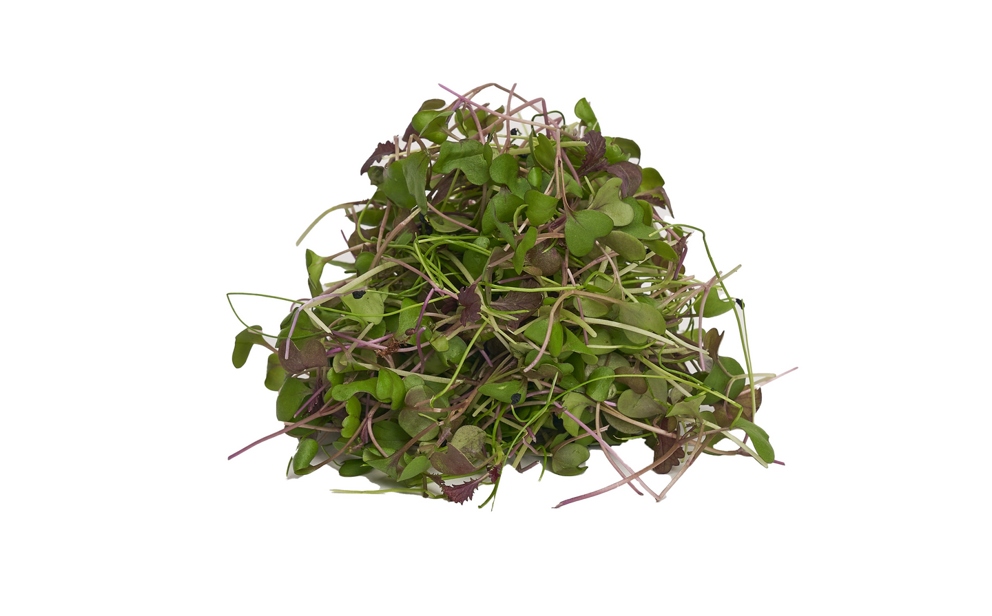 Runsasmakuinen ja ilmava sekoitus purjon, punakaalin ja sinapin versoista. Herkullinen salaatti esimerkiksi grillatuille lihoille ja mausteisille ruoille.