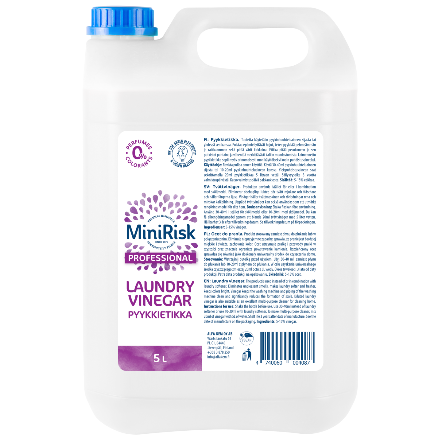 Ekologinen, luontopohjainen tuote. Hajusteeton ja väriaineeton. Käytetään pyykinhuuhteluaineen sijasta tai yhdessä sen kanssa. Poistaa epämiellyttävät hajut, tekee pyykistä pehmeämmän ja raikkaamman sekä pitää värit kirkkaina. Etikka pitää pesukoneen ja sen putkistot puhtaina ja vähentää merkittävästi kalkin muodostumista. Laimennettu etikka sopii myös erinomaisesti monikäyttöiseksi kodin puhdistusaineeksi.