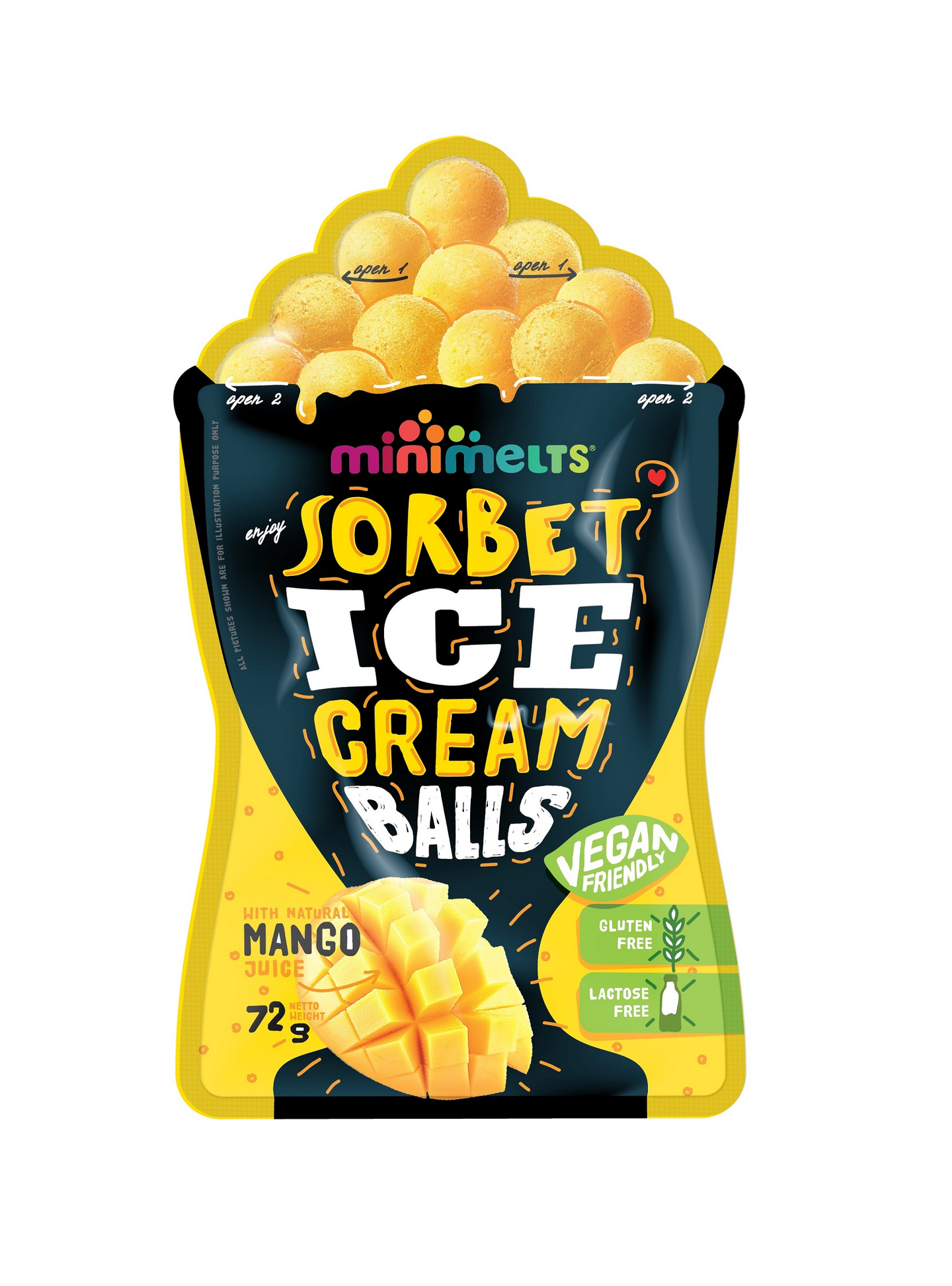 MiniMelts BIG mango sorbettipallot. Laktoositon ja gluteeniton. Vegaani.