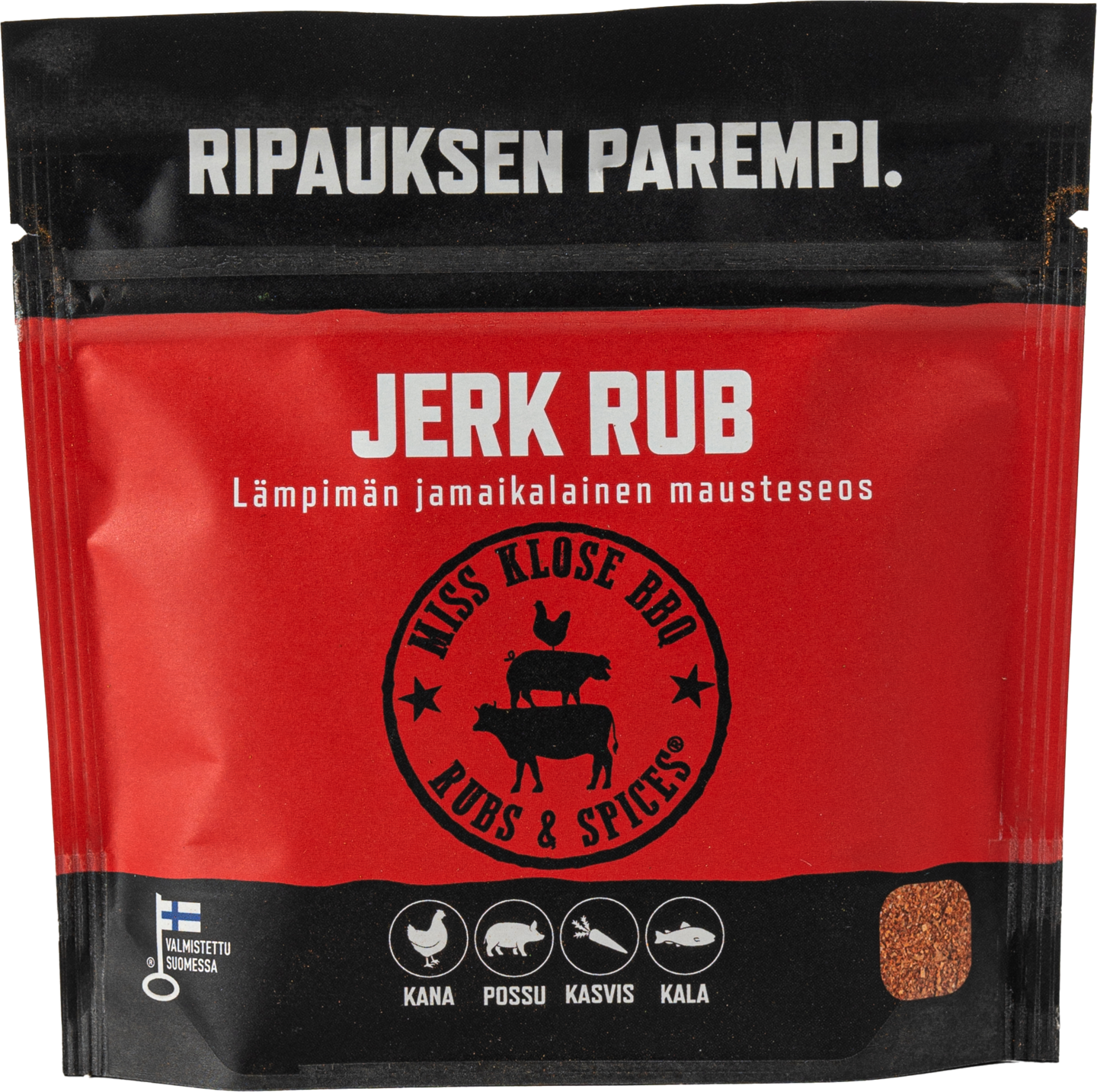 GluteenitonMiss Klose Jerk Rub on jamaikalaisesta BBQ-kulttuurista inspiraationsa saanut maustesekoitus. Se sopii erityisesti grillatulle kanalle ja porsaanlihalle. Hiero mausteseos ennen grillausta lihan pintaan. Klassisen Jerk-kanan viimeistelyyn sopii erinomaisesti Miss Klose Original BBQ -kastike. Kokeile myös kasviksille tai jopa hedelmille. Miss Klose Jerk Rub sopii myös yleiseen maustamiseen kotikeittiössä, kun haet ruokaasi karibialaisten mausteiden lämpöä. Käytä maun mukaan n. 2-3 rkl kiloa kohden.