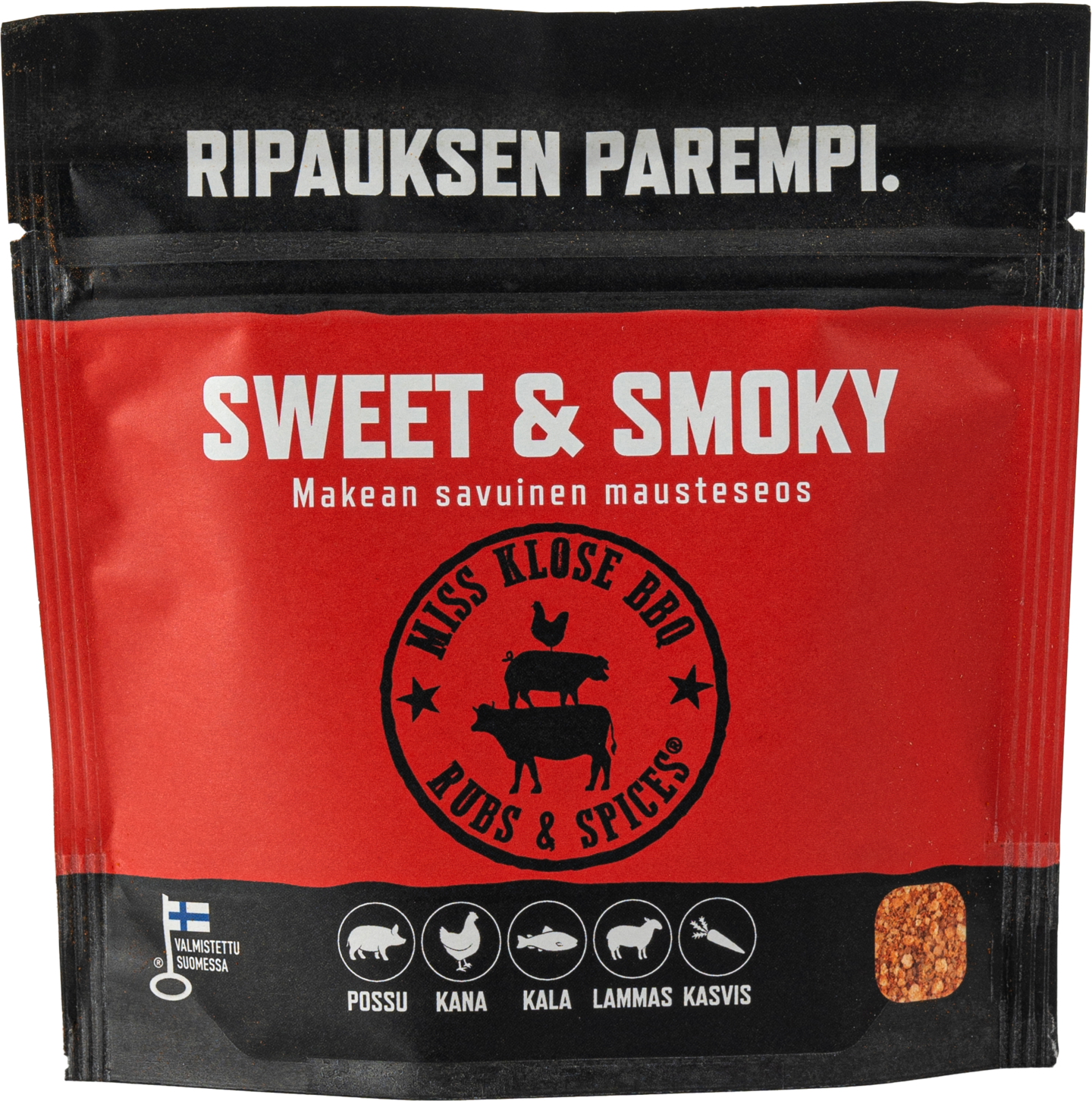 GluteenitonMiss Klose Sweet & Smoky sopii kaikelle grillattavalle porsaanlihalle ja kanalle. Hiero mausteseos ennen grillausta lihan pintaan. Alun perin se on suunniteltu täydelliseksi makupariksi porsaan ribseille. Viimeistelet Miss Klose Sweet & Smokyllä maustetut ribsit ylivertaisiksi Miss Klose Original BBQ -kastikkeella. Kokeile myös yleiseen maustamiseen kotikeittiössä esimerkiksi jauheliha- ja kasvisruokien tai vaikka burger-pihvin kanssa. Käytä maun mukaan n. 2-3 rkl kiloa kohden.