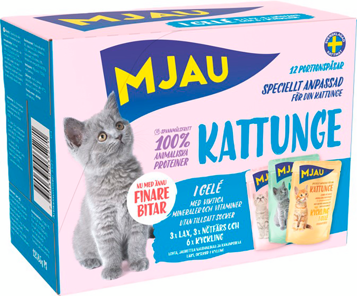 Mjau kissapennun liha & kala lajitelma sisältää 12 annospussia maistuvia makuja hyytelössä kissanpennuille aina 12 kuukauden ikään asti. Makuina on 3 pussia lohenmakuista märkäruokaa, 3 pussia nautaa sisältävää annospussia sekä 6 annospussia kananmakuista märkäruokaa. Tuote on viljaton ja vehnätön, eikä siihen ole lisätty sokeria. Eläinproteiini on 100% eläinperäistä ja märkäruoka on valmistettu luonnollisista raaka-aineista. Kissanpennuille suunnitellussa ravinnossa on lisätty myös kaikki pennun kehitykseen ja kasvuun tarvittavat vitamiinit ja kivennäisaineet. Pienet, maukkaat palat sopivat erinomaisesti pentujen suuhun. Makulajitelmassa on eri lähteistä eläinperäistä proteiinia, joten laaja-alaisempi proteiinikoostumus tukee myös pennun täysipainoista kehitystä. Valmistettu Ruotsissa.
