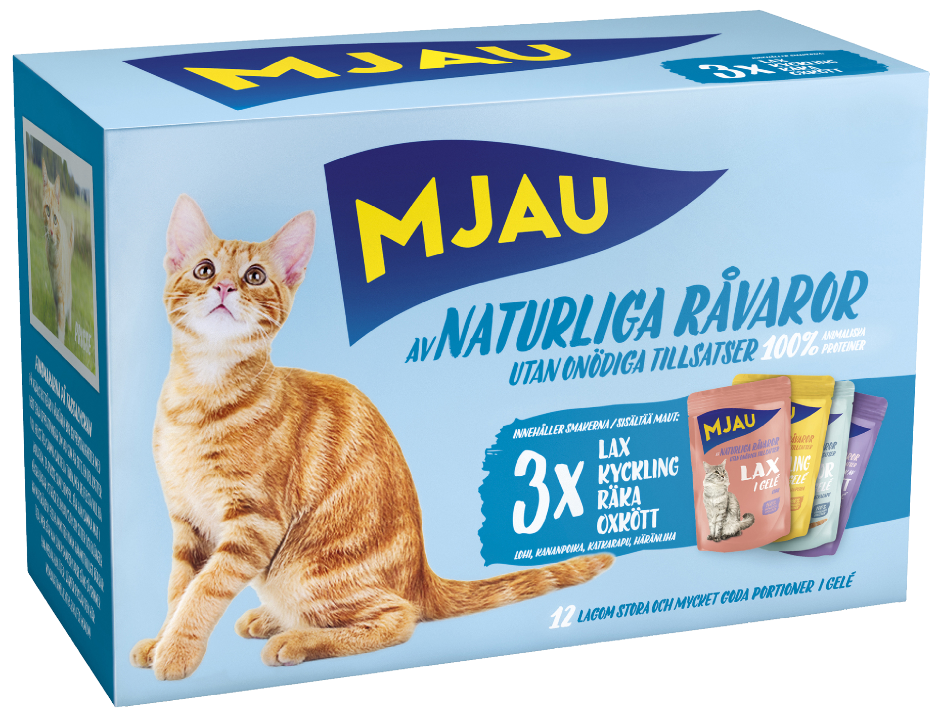 Mjau kalan ja lihanmakuisia paloja hyytelössä -lajitelma sisältää 12 annospussia (85 grammaa), makuinaan lohta (3kpl), kanaa (3kl), katkarapuja (3kpl) ja naudanlihaa (3kpl). Tämä tuote on valmistettu Ruotsin Vårgårdassa, puhtaista ja luonnollisista raaka-aineista. Tuote sisältää 100 prosenttia eläinproteiineja, siinä ei ole lisättyä sokeria tai viljaa. Yksi pussi on juuri oikea ateriakoko kissallesi. Tämä tuote valmistetaan huolella luon Vårgårdassa, keskellä Västgötlandin peltomaisemaa.
