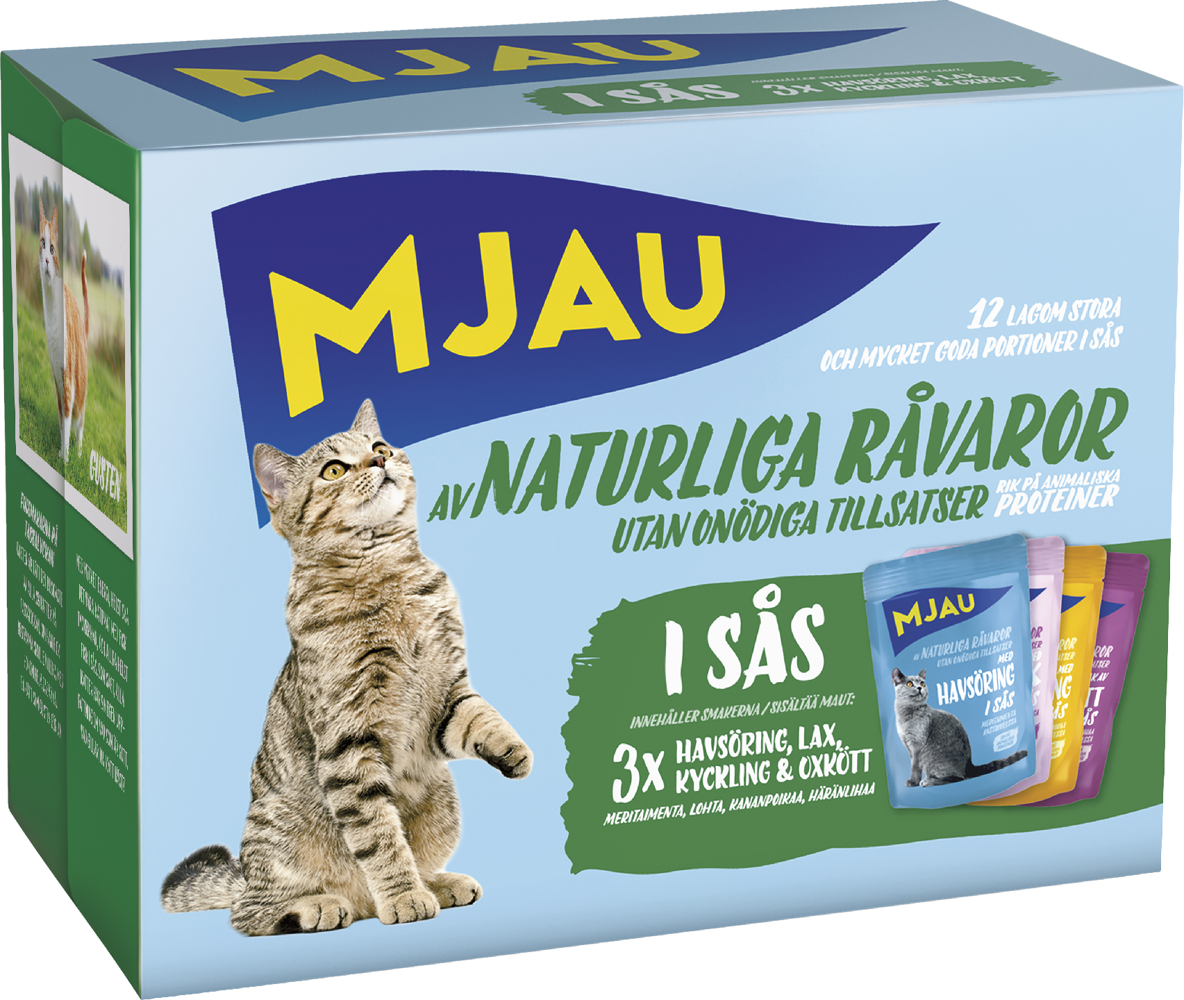 Mjau kissanruokaa kastikkeessa -lajitelma sisältää 12 annospussia, makuinaan meritaimenta (3kpl), lohta (3kpl), kanaa (3kpl) ja naudanlihaa (3kpl). Jokainen ateria sisältää 85 grammaa paloja kastikkeessa. Tämä tuote on valmistettu Ruotsin Vårgårdassa, puhtaista ja luonnollisista raaka-aineista. Tuote sisältää runsaasti eläinproteiineja ja siinä ei ole lisättyä sokeria tai väriaineita. Jokainen ruokalaji on juuri oikean kokoinen ateria kissallesi.