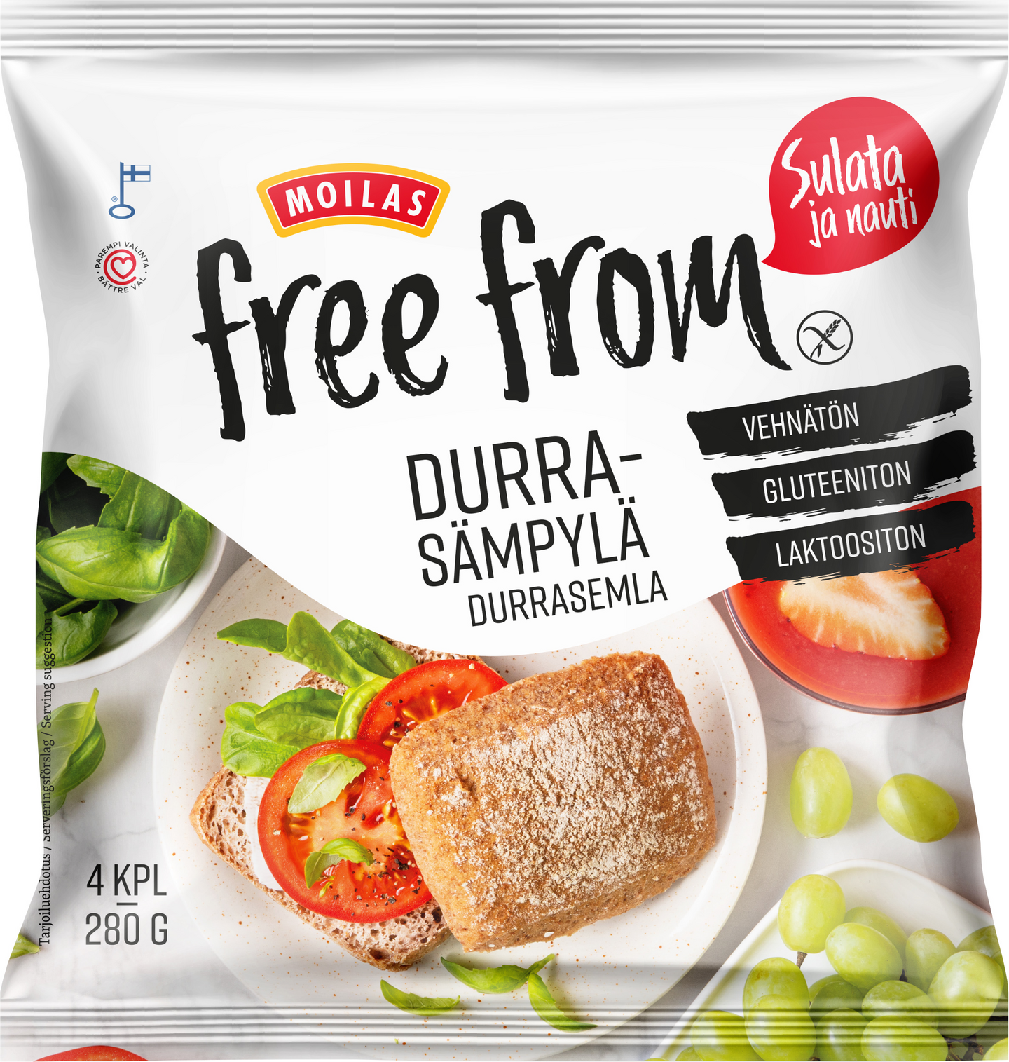 VegaaninenMoilas Free From Durrasämpylä on gluteeniton, runsaskuituinen sämpylä, jolle on myönnetty Sydänmerkki. Durrasämpylä (70 g) sisältää täysjyvädurraa ja -teffiä yhteensä 20 g. Sulata, päällystä mieleisilläsi täytteillä ja nauti.