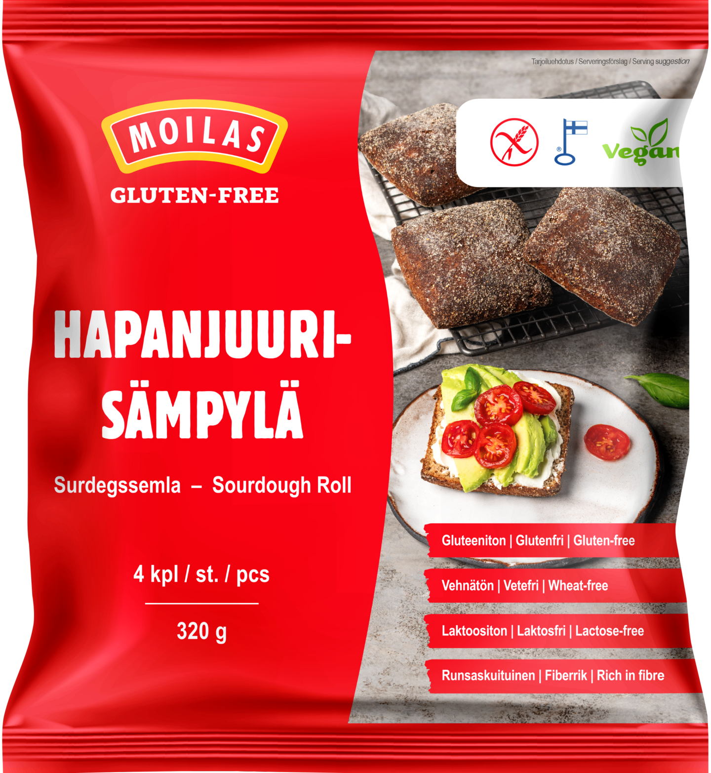 VegaaninenHapanjuureen leivottu, tumma, maukas ja pehmeä, gluteeniton sämpylä. 96 % sämpylän viljaraaka-aineista on gluteenitonta, suomalaista täysjyväkauraa. Kypsä pakaste - sulata ja nauti.