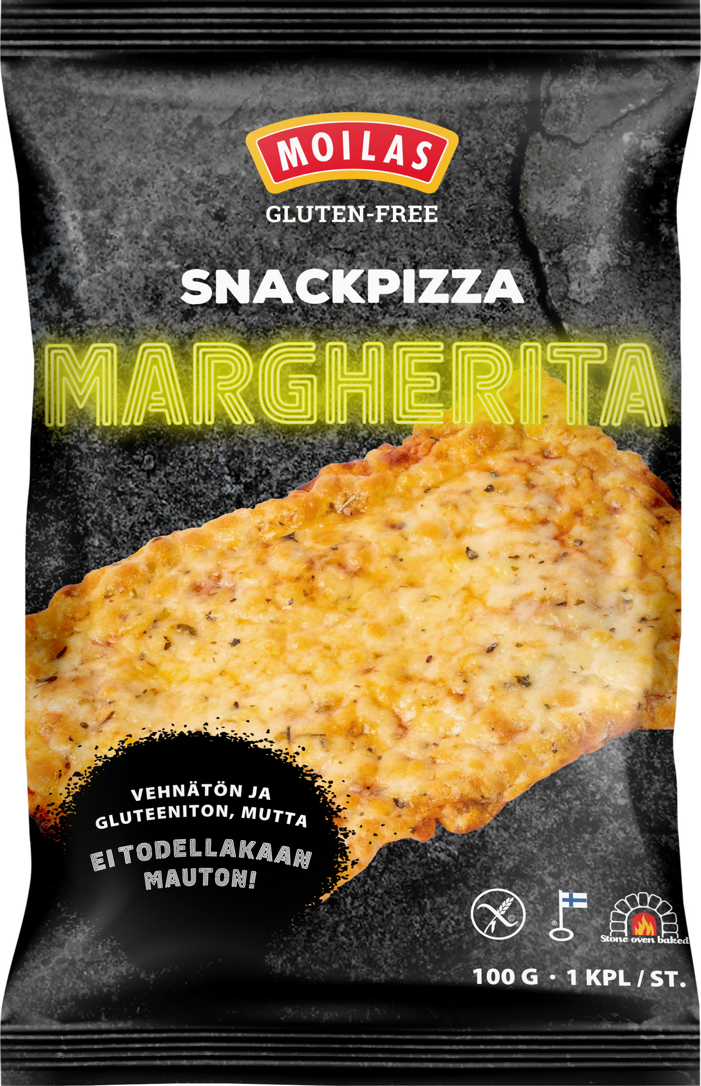 LaktoositonOhut pohja ja täytteenä runsaasti mozzarellajuustoa. Juuri sopivan kokoinen ja nopea välipala suolaisennälkään. Lämmitä pari minuuttia mikroaaltouunissa ja sitten vaan ääntä kohti. Moilas Snackpizza on vehnätön ja gluteeniton, mutta ei todellakaan mauton!