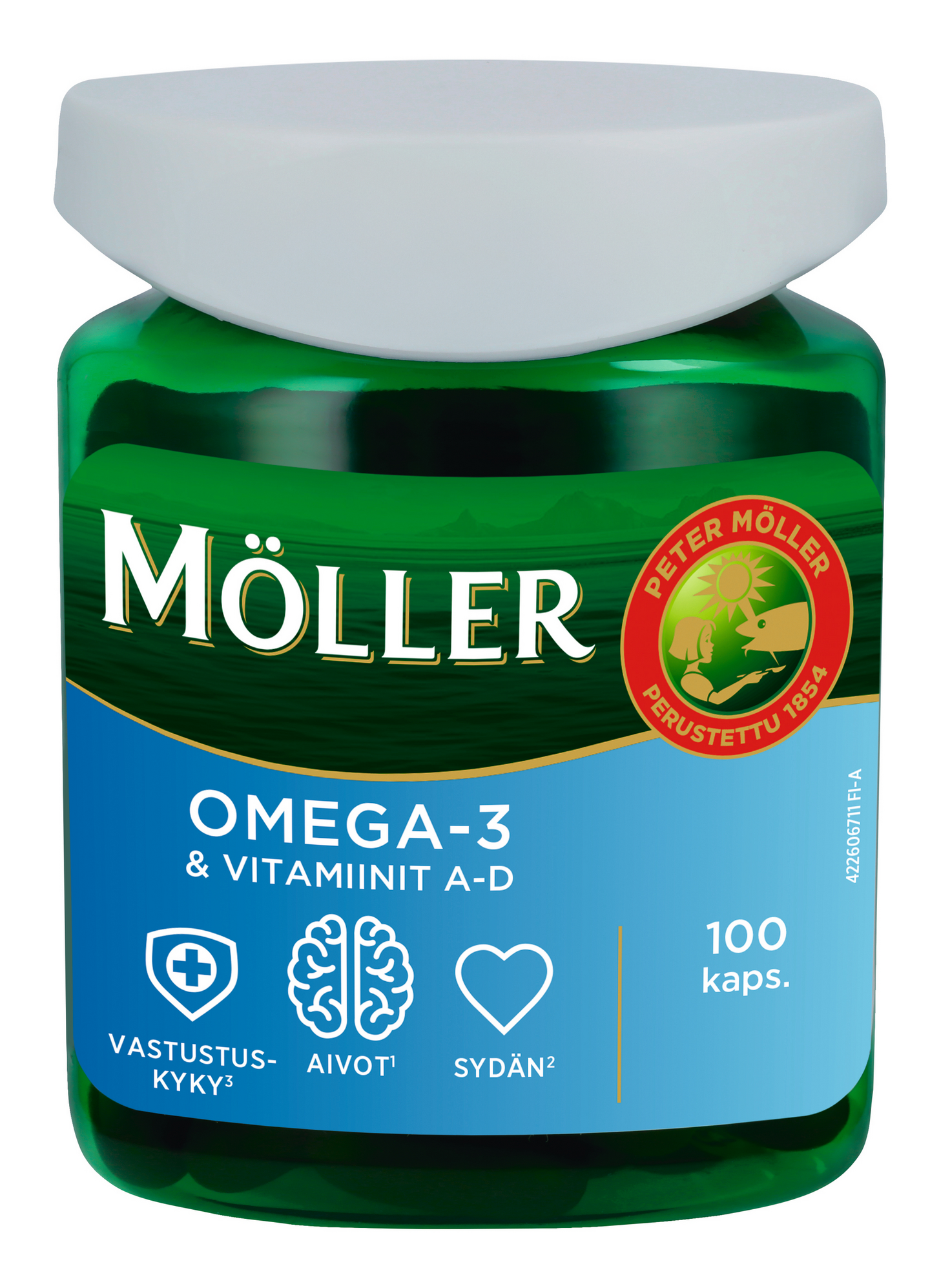 LaktoositonMöller Omega-3-kapselit sisältävät kalanmaksaöljyä, joka on puristettu norjalaisesta turskasta. Sisältää A- ja D-vitamiineja sekä omega-3-rasvahappoja (EPA ja DHA). Suositeltava vuorokausiannos: 2-4 kapselia. Helposti nieltävät kapselit. Purkki valmistettu osittain kierrätysmuovista. Ravintolisä ei korvaa monipuolista ja tasapainoista ruokavaliota eikä terveitä elämäntapoja.