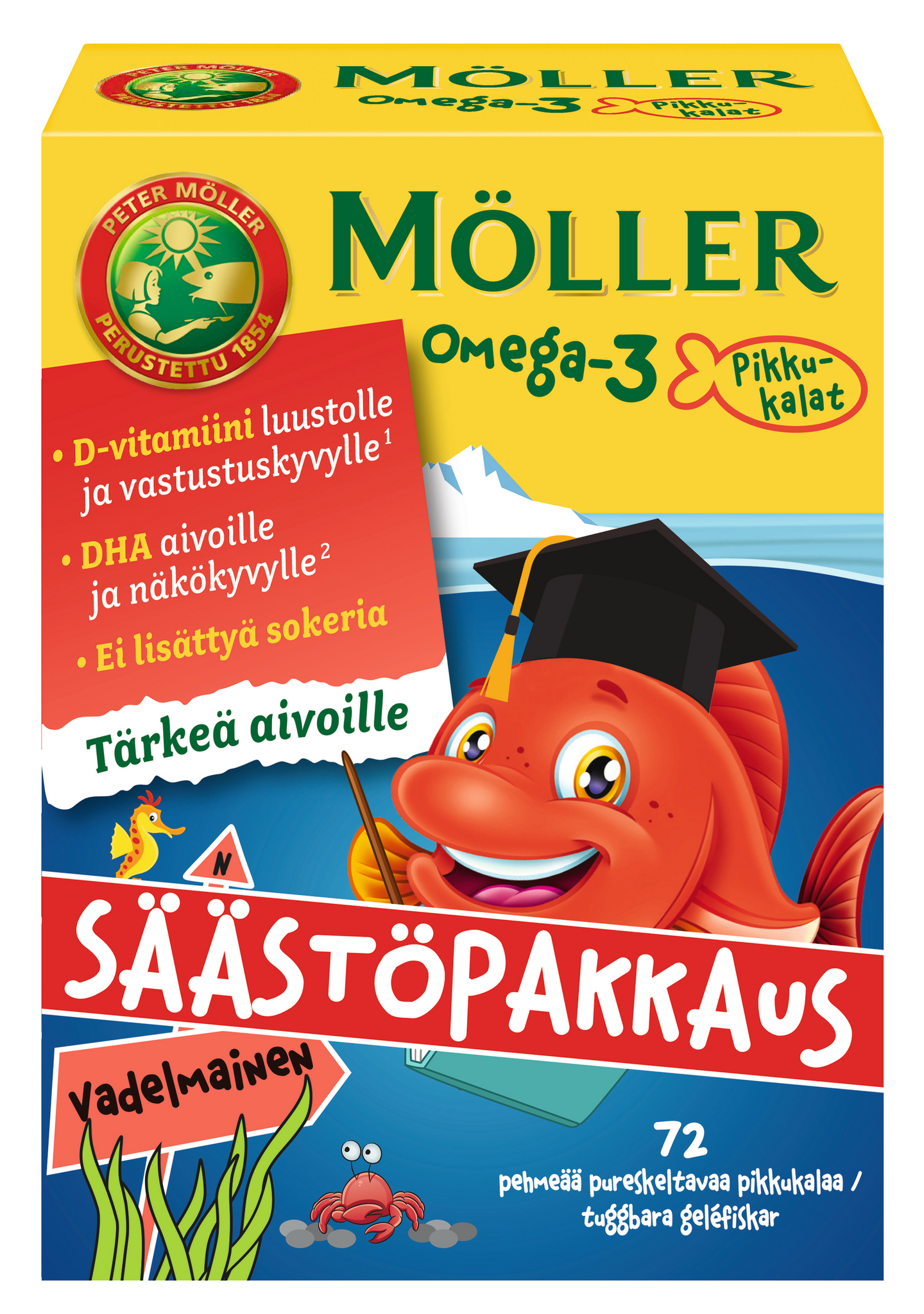 Möller Pikkukalat Vadelmainen sisältää omega-3-rasvahappoja (DHA+EPA) ja lasten luuston normaalille kasvulle ja kehitykselle välttämätöntä D-vitamiinia. D-vitamiini edistää myös immuunijärjestelmän normaalia toimintaa lapsilla. DHA edistää aivotoiminnan ja näkökyvyn pysymistä normaaleina. Edullinen vaikutus saavutetaan nauttimalla 250 mg DHA/vrk. Pikkukalat ovat pehmeitä ja pureskeltavia, ja niissä on hyvä marjaisa maku. Ei lisättyä sokeria, makeutettu ksylitolilla ja sorbitolilla. Suositeltava vuorokausiannos lapsille 3-vuotiaasta alkaen ja aikuisille: 2 kpl. Ravintolisä ei korvaa monipuolista ja tasapainoista ruokavaliota eikä terveitä elämäntapoja.