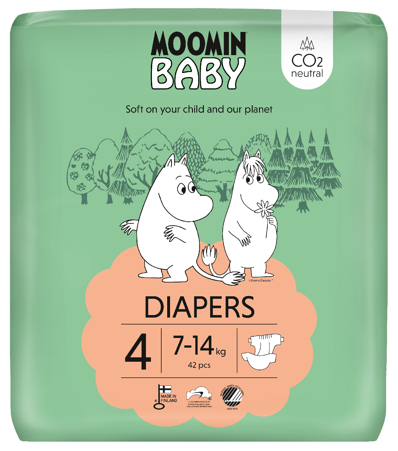 Suomen ainoassa vaippatehtaassa Tammisaaressa valmistettu ja uudistunut Muumivaippa istuu nyt entistä paremmin, on helpompi säätää lapselle täydelliseksi ja on kaiken lisäksi hiilineutraali! Yhteistyössä Allergia-, Iho- ja Astmaliiton kanssa kehitetty vaippa on erityisen pehmeä ja ihoystävällinen. Vaipan taka- ja sivujoustot takaavat paremman istuvuuden ja estävät sivu- ja selkävuodot. Vaipan tehokkaasti nestettä imevä ydin sisältää luonnonmukaista, hajoavaa selluloosaa, joka on peräisin sertifioiduista pohjoismaisista metsistä. Moomin Baby -vaipat sopivat niin päivä- kuin yökäyttöön.