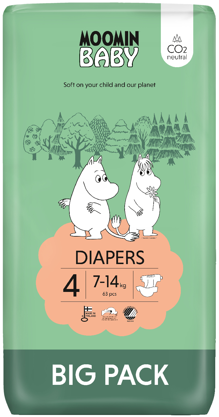 Suomen ainoassa vaippatehtaassa Tammisaaressa valmistettu ja uudistunut Muumivaippa istuu nyt entistä paremmin, on helpompi säätää lapselle täydelliseksi ja on kaiken lisäksi hiilineutraali! Yhteistyössä Allergia-, Iho- ja Astmaliiton kanssa kehitetty vaippa on erityisen pehmeä ja ihoystävällinen. Vaipan taka- ja sivujoustot takaavat paremman istuvuuden ja estävät sivu- ja selkävuodot. Vaipan tehokkaasti nestettä imevä ydin sisältää luonnonmukaista, hajoavaa selluloosaa, joka on peräisin sertifioiduista pohjoismaisista metsistä. Moomin Baby -vaipat sopivat niin päivä- kuin yökäyttöön.