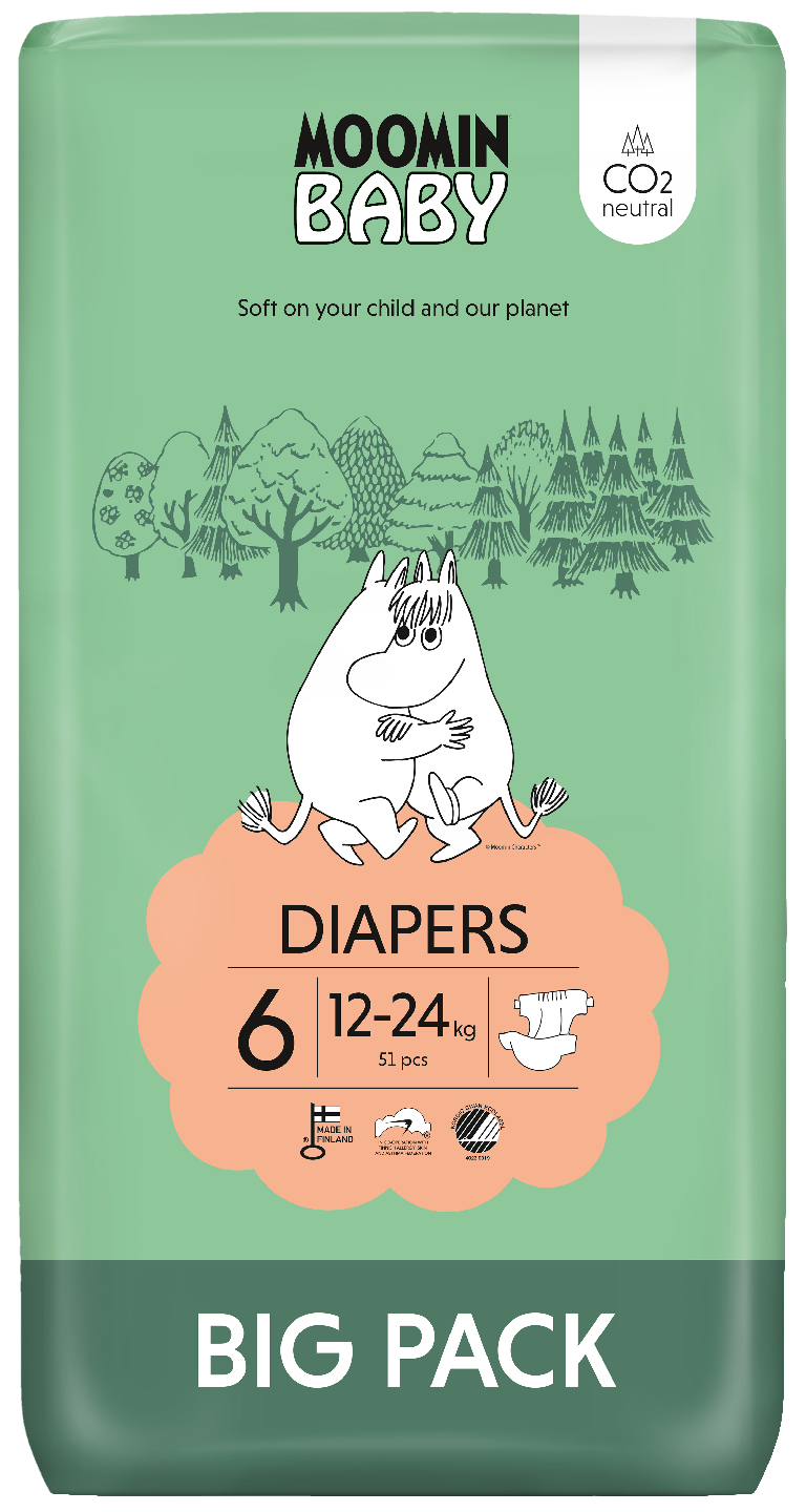Suomen ainoassa vaippatehtaassa Tammisaaressa valmistettu ja uudistunut Muumivaippa istuu nyt entistä paremmin, on helpompi säätää lapselle täydelliseksi ja on kaiken lisäksi hiilineutraali! Yhteistyössä Allergia-, Iho- ja Astmaliiton kanssa kehitetty vaippa on erityisen pehmeä ja ihoystävällinen. Vaipan taka- ja sivujoustot takaavat paremman istuvuuden ja estävät sivu- ja selkävuodot. Vaipan tehokkaasti nestettä imevä ydin sisältää luonnonmukaista, hajoavaa selluloosaa, joka on peräisin sertifioiduista pohjoismaisista metsistä. Moomin Baby -vaipat sopivat niin päivä- kuin yökäyttöön.