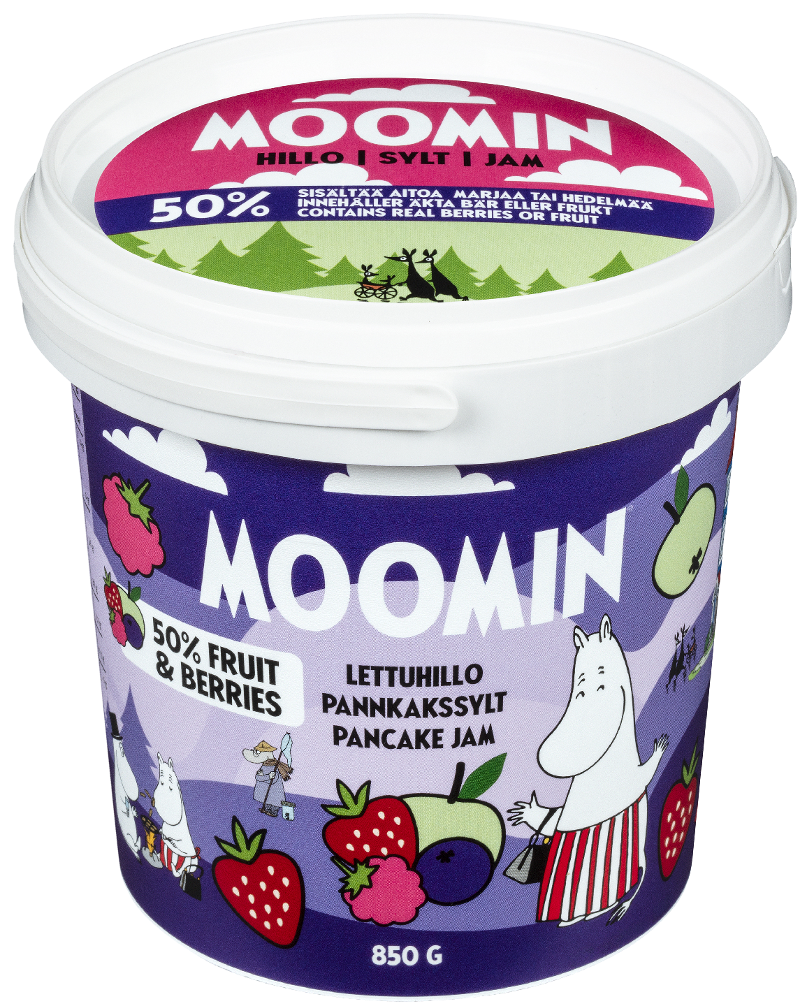 Täydellinen lisä lettuhetkiin! Herkkumaan Moomin-lettuhillo on täynnä marjaisaa makua ja sisältää 50 % aitoja marjoja ja hedelmää. Lettuhillo saa makunsa omenasta, mansikasta, vadelmasta, mustikasta ja punaherukasta. Levitä lämpimien lettujen päälle ja nauti – muumien tavoin!