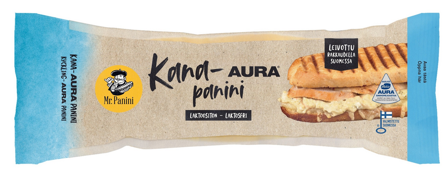 Paninileipä (Suomi) 49 %: VEHNÄJAUHO, vesi, auringonkukansiemen, pellavansiemen, jodioitu suola, VEHNÄLESE, rapsiöljy, hiiva. Broilerinfilee 26 %: broileri (Suomi), vesi, dekstroosi, suola, tapiokatärkkelys, stabilointiaineet (E450, E451). Mr. Panini sinihomejuustomajoneesi: rapsiöljy, Valio AURA® SINIHOMEJUUSTO (Suomi) 6 %, vesi, sipuli, KANANMUNANKELTUAINEN, sokeri, etikka, suola, sakeuttamisaineet (guarkumi, ksantaanikumi), säilöntäaine (E202). JUUSTO (Suomi).