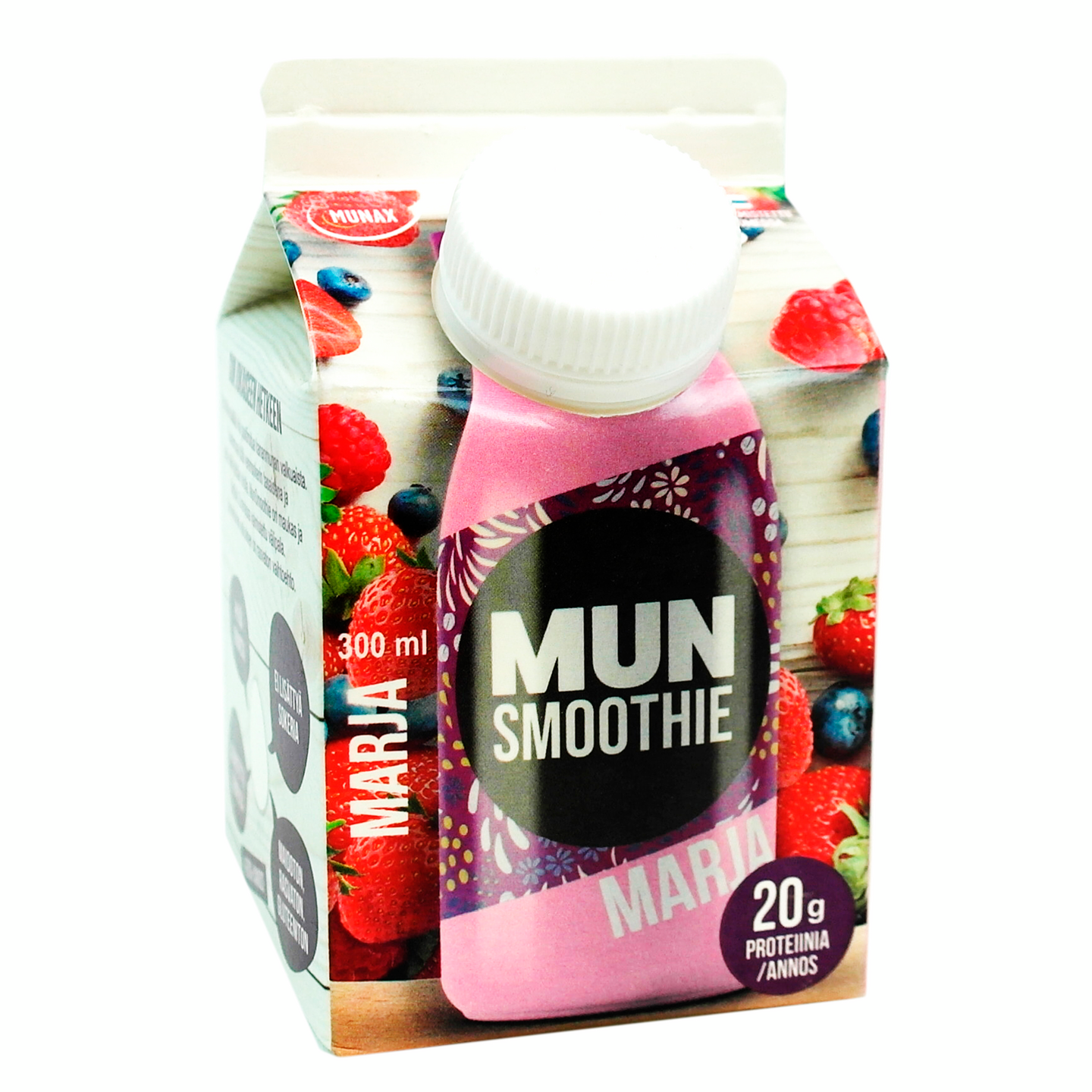 MunSmoothie on runsasproteiininen välipala, joka valmistetaan pastöroidusta kotimaisesta kananmunan valkuaisesta sekä aidoista marjoista ja hedelmistä. Yksi tölkki sisältää jopa 20-25g proteiinia. Tuote on täysin maidoton, gluteeniton, laktoositon ja rasvaton. Helppo ja täyttävä välipala kiireisiin päiviin!