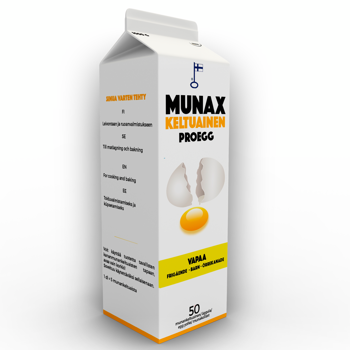 KANANMUNAN KELTUAINEN 70 %, KANANMUNA 28 %, säilöntäaine (kaliumsorbaatti), happamuudensäätöaine (sitruunahappo). Valmistettu suomalaisista lattiakanalan kananmunista. Pakattu suojakaasuun. Tuote on pastöroitu.