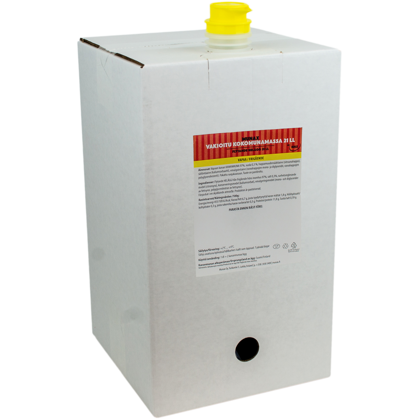 Nestemäinen kokomunamassa tuo tehokkuutta ja vaivattomuutta ammattikeittiöiden, teollisuuden ja leipomoiden arkeen. Tuote on tasalaatuinen ja hygieeninen, sekä täysin käyttövalmis. Käytetään kananmunan tapaan leivontaan ja ruoanvalmistukseen. Tuotteen pidennetty säilyvyysaika tuo joustoa tilauskäytäntöihin sekä varastonhallintaan. Tämä pastöroitu nestemäinen kokomunamassa on valmistettu vastuullisesti tuotetuista, kotimaisista lattiakanojen munista omalla tehtaallamme Laitilassa. Kokomunamassa tarjoaa tasalaatuisen lopputuloksen jokaisella käyttökerralla, vastaten ammattikeittiöiden ja leipomoiden vaativiin odotuksiin.