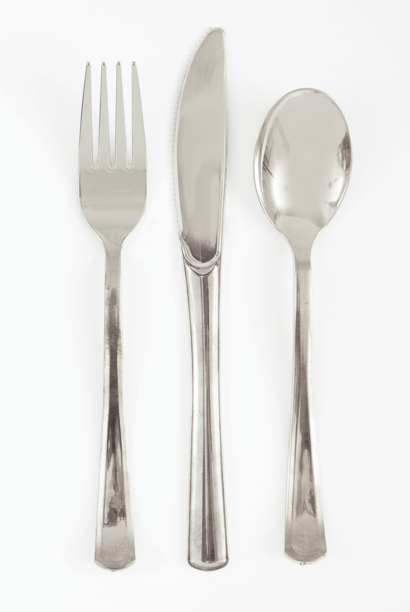 Hopeanväriset uudelleenkäytettävät muoviaterimet 18 kpl. Paketissa 6 kpl veitsiä, 6 kpl haarukoita ja 6 kpl lusikoita.