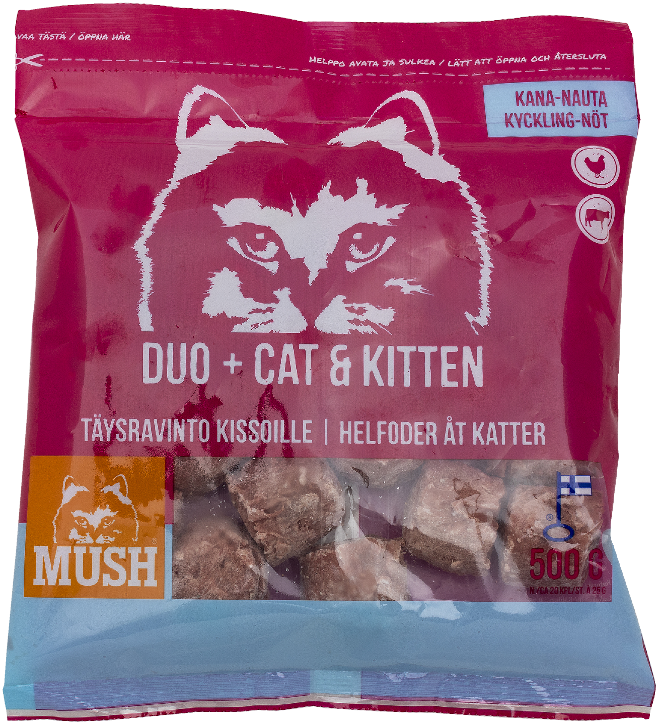 GluteenitonMUSH DUO+ CAT® on täysravintomme kissoille, joka on kehitetty sinulle joka haluat antaa kissallesi lajityypillistä ruokaa ja olla varma siitä että kissasi saa kaiken tarvitsemansa ruoasta. Täysrehu kissoille, sopii myös kissanpennuille.
