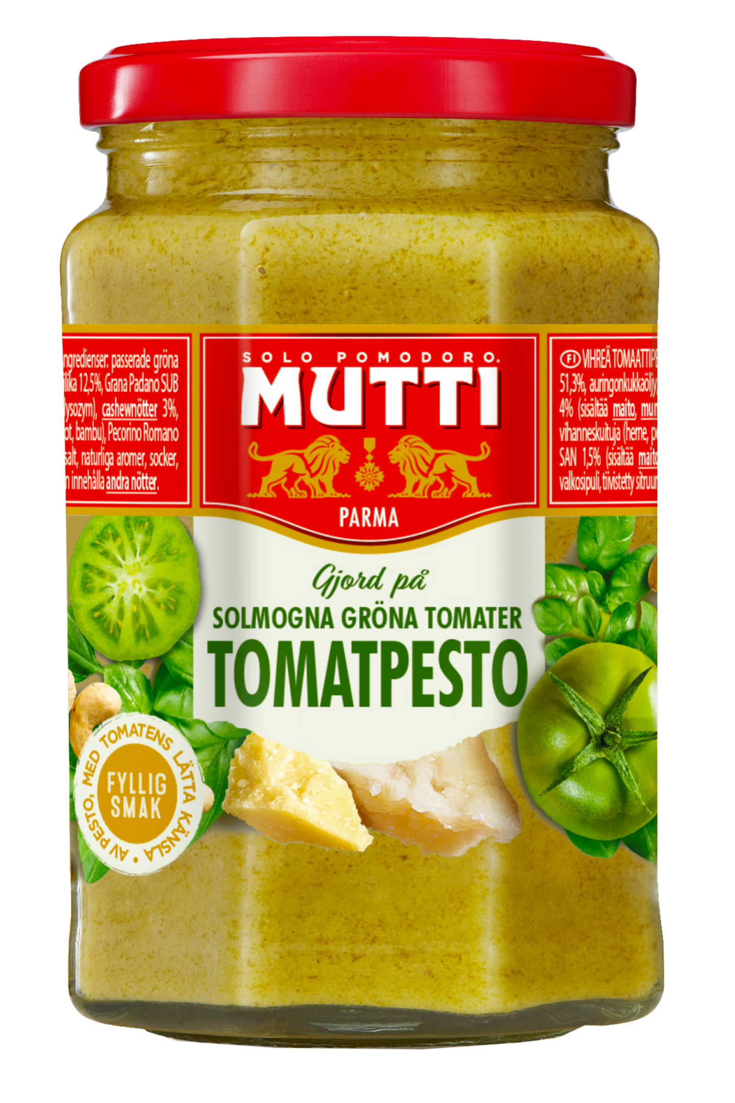 Paseerattu vihreä tomaatti 37 %, Basilico Genovese San -basilika 22 %, auringonkukkaöljy, Parmigiano Reggiano San* -JUUSTO (MAITO, suola, juoksete) 5 %, paseerattu tomaatti 5 %, oliiviöljy, CASHEWPÄHKINÄÄ 4,3 %, luontaiset aromit, suola, sokeri, kasvikuituja (herne, porkkana, bambu), tapiokatärkkelys. Saattaa sisältää muita PÄHKINÖITÄ.