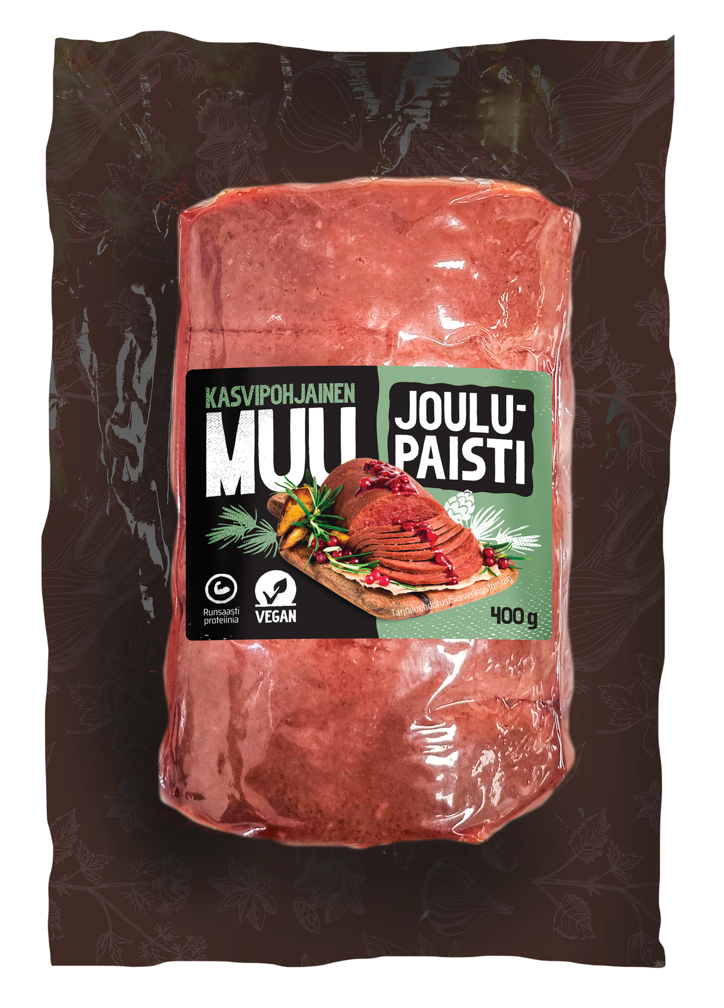 VegaaninenMUU Joulupaisti on kypsä vehnäproteiinipohjainen tuote, jonka voi nauttia sellaisenaan tai lämmittää pakkauksen ohjeen mukaan. Maukas paisti on juhlapöydän uusi kunkku, joka maistuu tuttujen