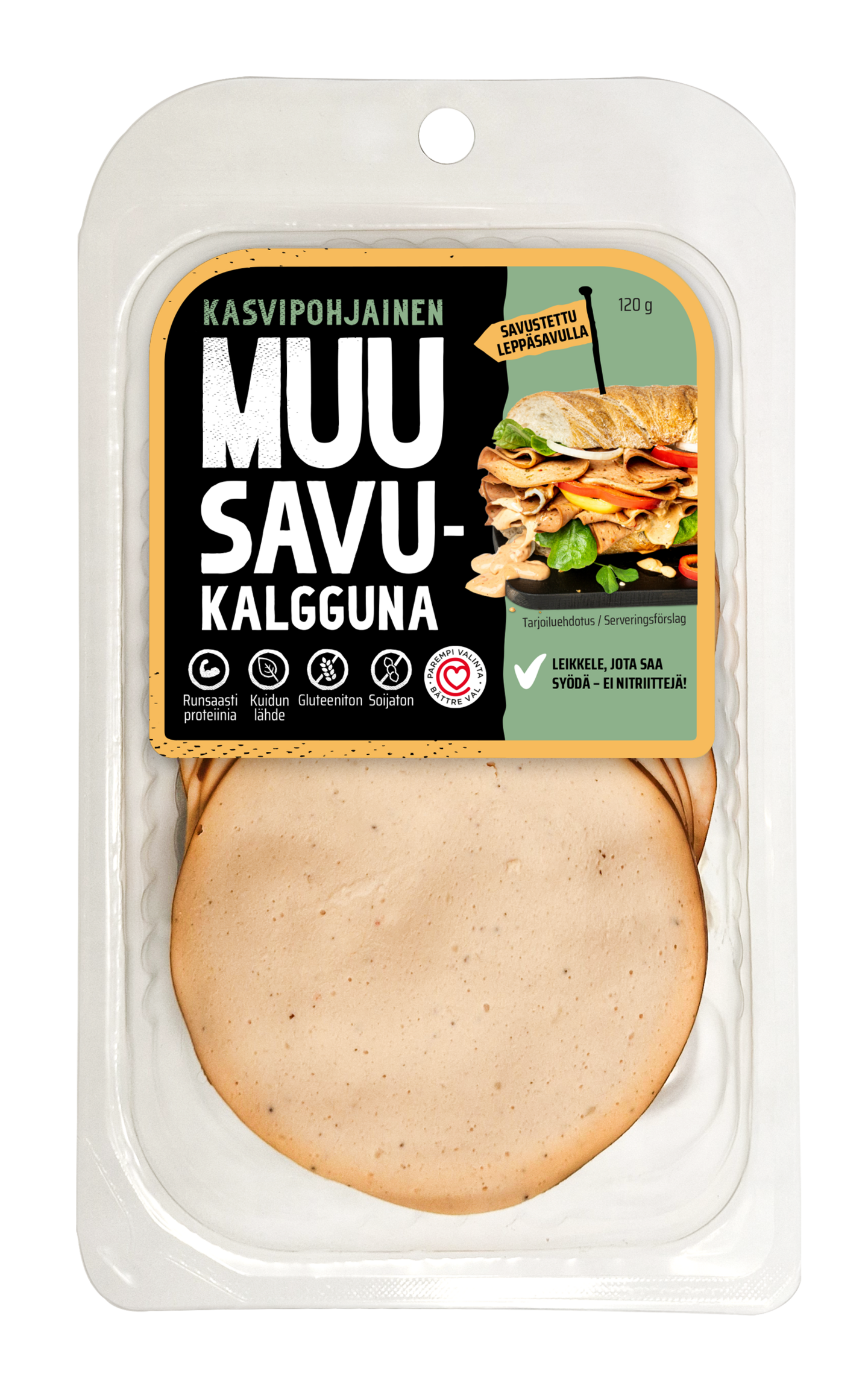 VegaaninenVihdoinkin leikkele, jota saa syödä! MUU Savukalgguna on fermentoidusta härkäpavusta valmistettu maukas leikkele, jossa ei ole nitriittejä. Aidolla leppäsavulla savustettu kalkkunaton leikkele on herkullinen valinta sämpylöiden täytteeksi tai värikkäälle napostelulautaselle. MUU Savukalggunalle on kuidun lähde ja tuotteella on myös Sydänmerkki.