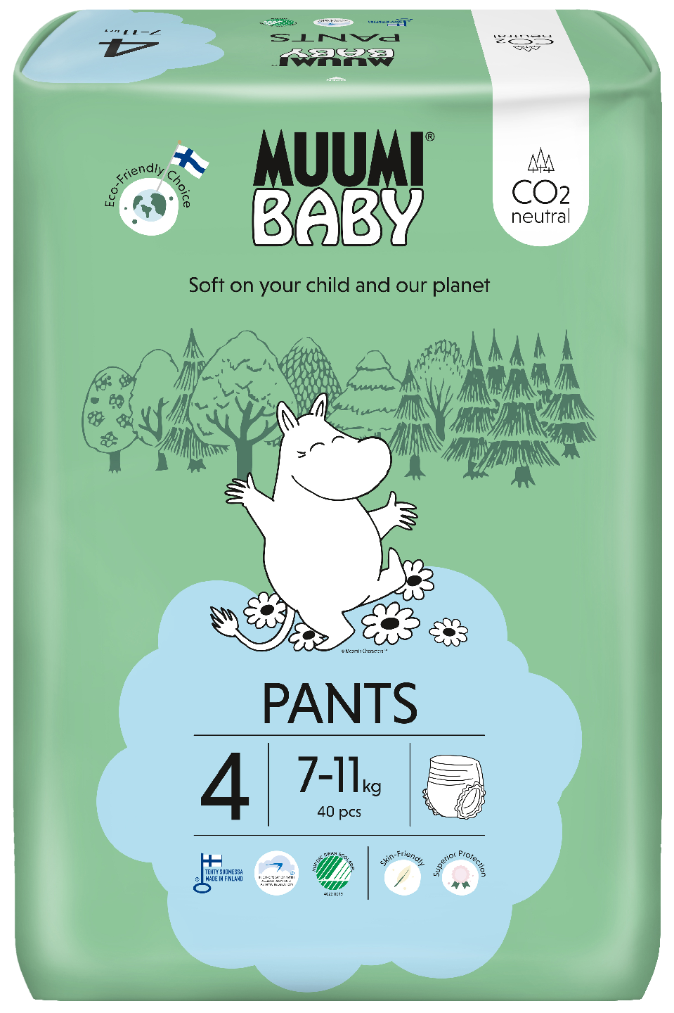 Suomessa valmistettu Muumi Baby Pants -housuvaippa on täysin hiilineutraali! Yhteistyössä Allergia-, Iho- ja Astmaliiton kanssa kehitetty vaippa on erityisen pehmeä ja ihoystävällinen. Vaipan taka- ja sivujoustot takaavat paremman istuvuuden ja estävät sivu- ja selkävuodot. Vaipan tehokkaasti nestettä imevä ydin sisältää luonnonmukaista, hajoavaa selluloosaa, joka on peräisin sertifioiduista pohjoismaisista metsistä. Muumi Baby Pants -housuvaipat sopivat niin päivä- kuin yökäyttöön.
