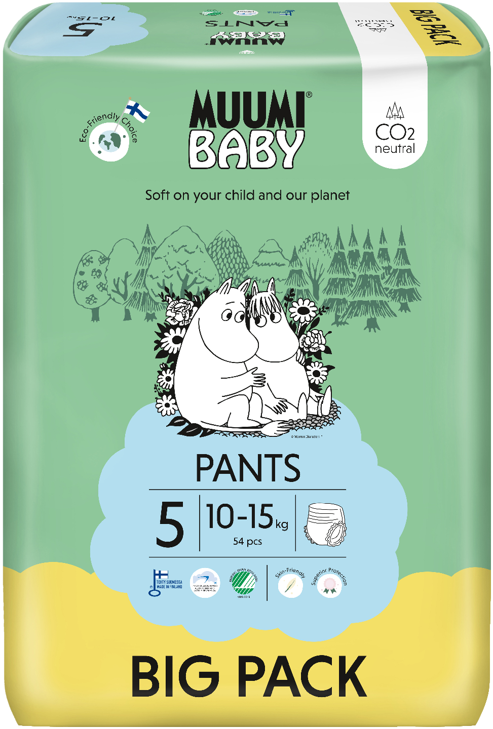 Suomessa valmistettu Muumi Baby Pants -housuvaippa on täysin hiilineutraali! Yhteistyössä Allergia-, Iho- ja Astmaliiton kanssa kehitetty vaippa on erityisen pehmeä ja ihoystävällinen. Vaipan taka- ja sivujoustot takaavat paremman istuvuuden ja estävät sivu- ja selkävuodot. Vaipan tehokkaasti nestettä imevä ydin sisältää luonnonmukaista, hajoavaa selluloosaa, joka on peräisin sertifioiduista pohjoismaisista metsistä. Muumi Baby Pants -housuvaipat sopivat niin päivä- kuin yökäyttöön.
