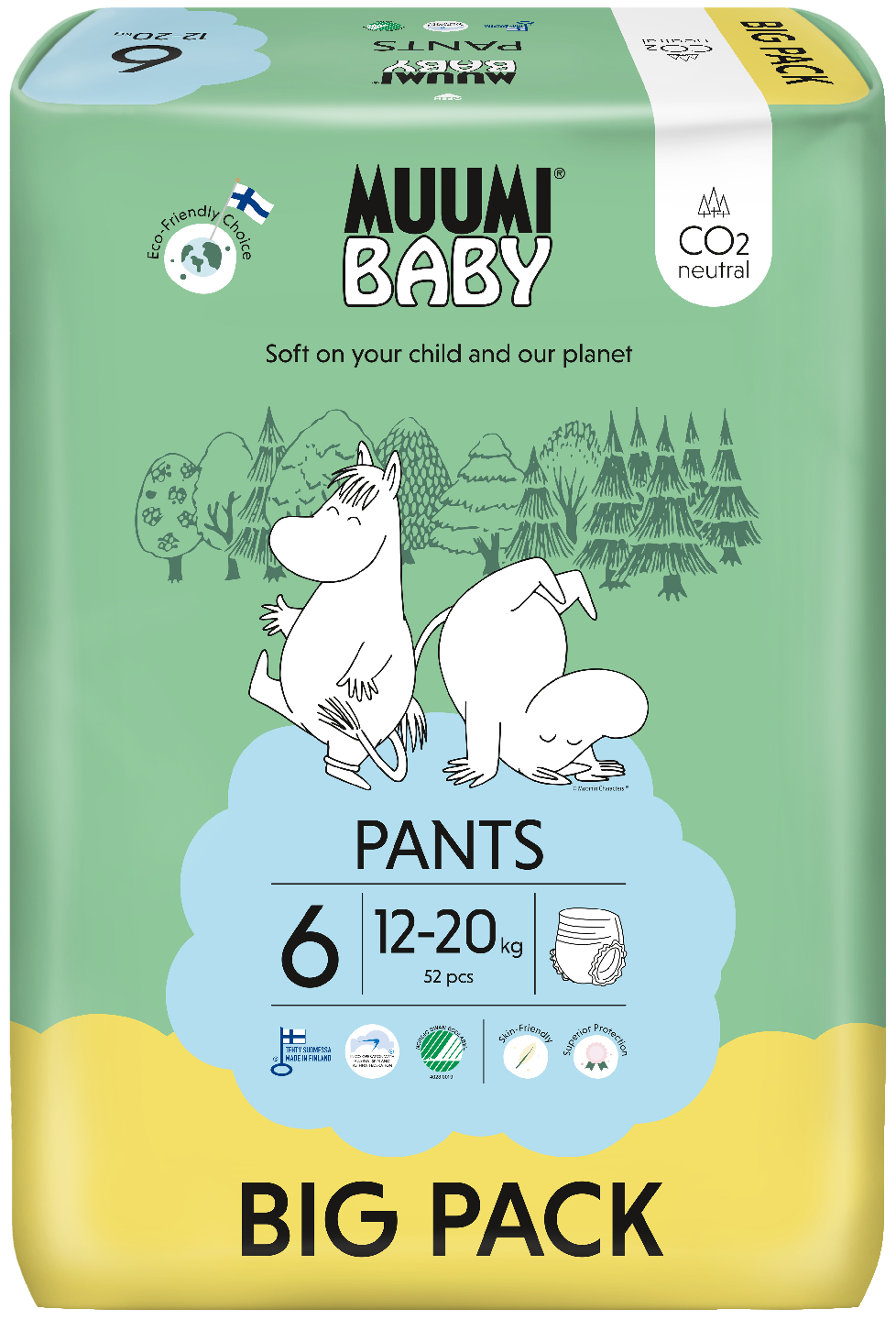 Suomessa valmistettu Muumi Baby Pants -housuvaippa on täysin hiilineutraali! Yhteistyössä Allergia-, Iho- ja Astmaliiton kanssa kehitetty vaippa on erityisen pehmeä ja ihoystävällinen. Vaipan taka- ja sivujoustot takaavat paremman istuvuuden ja estävät sivu- ja selkävuodot. Vaipan tehokkaasti nestettä imevä ydin sisältää luonnonmukaista, hajoavaa selluloosaa, joka on peräisin sertifioiduista pohjoismaisista metsistä. Muumi Baby Pants -housuvaipat sopivat niin päivä- kuin yökäyttöön.
