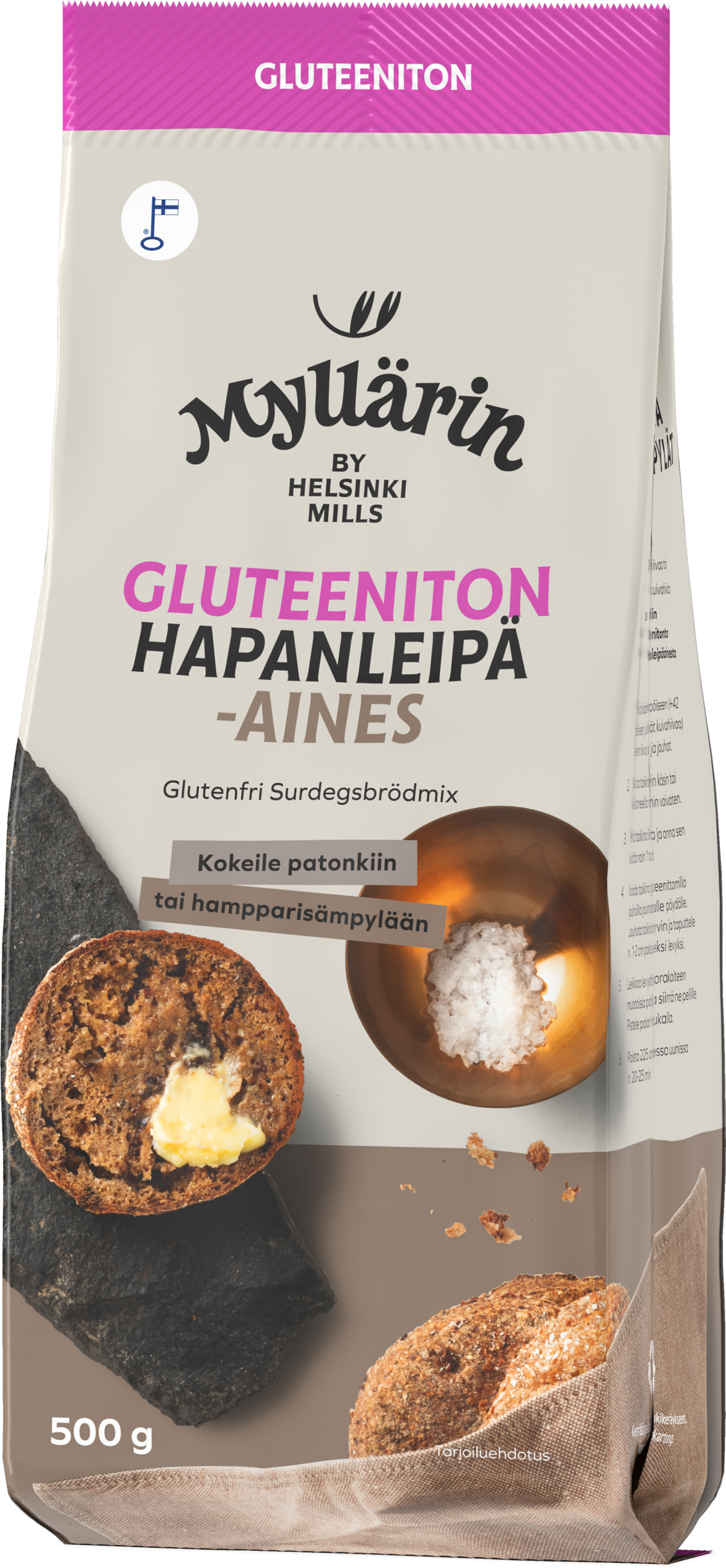 GluteenitonMyllärin Gluteenittomassa Hapanleipäaineksessa on aito hapate, joka tekee palaleivistä ja sämpylöistä kuohkeita ja hyvin säilyviä. Taikinaa on helppo käsitellä ja aidon hapanleivän maku vie kielen mennessään. Pakkauksen voi kierrättää keräyskartonkina.